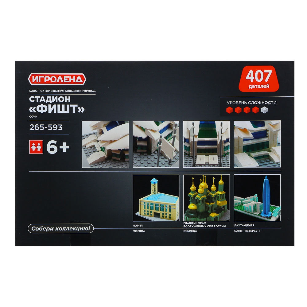 Конструктор ИГРОЛЕНД «Здания большого города» – это увлекательная игрушка, которая понравится как детям, так и взрослым. Набор предназначен для детей от 6-ти лет. Конструктор не только развивает логику и пространственное воображение, но и познакомит ребенка с важными достопримечательностями нашей страны. С помощью данного набора ребенок сможет воссоздать здание стадиона Фишт. Готовая конструкция обязательно станет украшением интерьера.