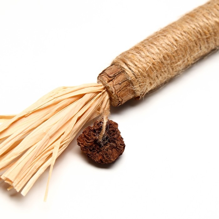 Игрушка сделана из натуральных материалов- сизаля и мататаби, которые привлекают и веселят как котят, так и взрослых кошек. Бережно заботится о зубах, во время игры нить массирует десну животному и очищает зубы от налета и остатков пищи. а также помогает справиться со стрессом и агрессией.