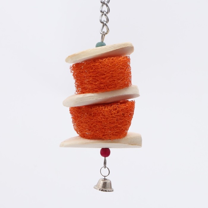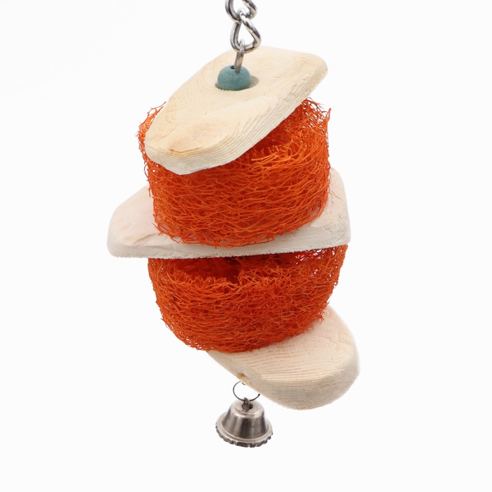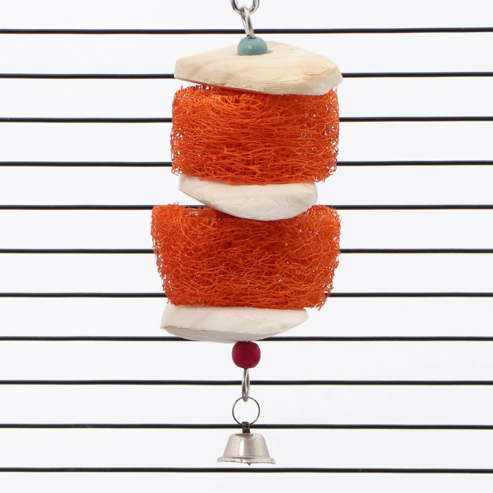 Игрушка оснащена звонким колокольчиком, который привлекает внимание и стимулирует интерес, добавляя элемент игры. Этот аксессуар можно легко прикрепить к клетке, что делает его удобным в использовании. Она отлично подходит как для попугаев, так и для других декоративных птиц, помогая им оставаться активными и здоровыми.