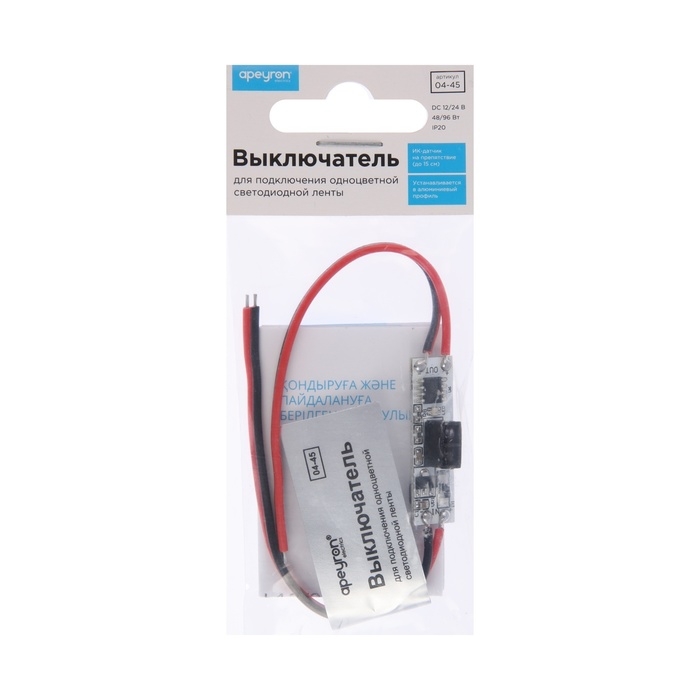 ИК-выключатель на препятствие 04-45 предназначен для управления светодиодной монохромной лентой 12/24 В. Выключатель устанавливается в алюминиевый профиль, в экране которого необходимо сделать отверстие размером 7х5 мм для работы датчика. При открытии дверцы ящика свет включается, при закрытии — выключается. Зона срабатывания до 15 мм. Одно из преимуществ данного изделия заключается в возможности работать как от напряжения 12 В, так и 24 В, а значит его можно использовать со светодиодными лентами с соответствующим напряжением. Важно отметить, что в зависимости от того с каким напряжением предстоит работать устройству, будет отличаться и максимальная мощность нагрузки, которую можно подключить к нему. Так, при напряжении 12 В максимальная нагрузка будет равна 48 Вт, а при напряжении 24 В уже 96 Вт. Это значит, что к данному изделию вы можете подключить в два раза больше светодиодной ленты 24 В. Встраиваемый выключатель имеет размеры 33х10х4,8 мм. Степень защиты от пыли и влаги соответствует стандарту IP20, что подразумевает установку устройства в сухом, проветриваемом помещении.