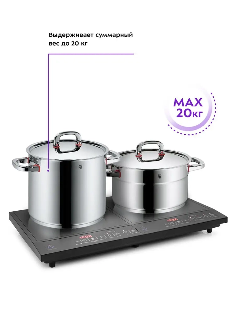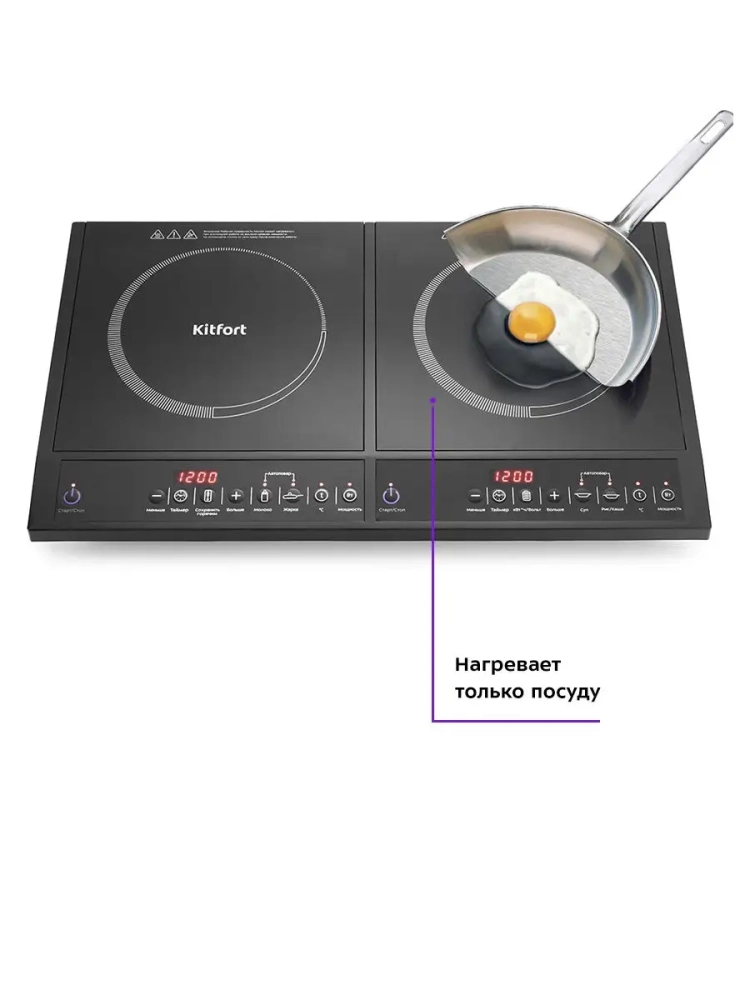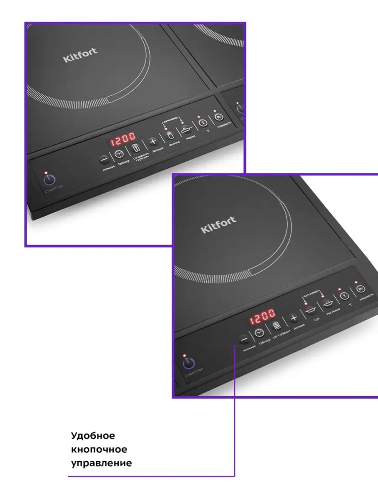 Настольная индукционная плита Kitfort КТ-104 с двумя независимыми конфорками понравится поклонникам кнопочного управления. Плиту легко и удобно мыть. Каждая конфорка имеет свою кнопочную управляющую панель и яркий LED дисплей, которые могут работать независимо друг от друга.