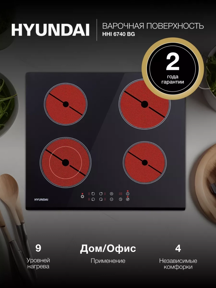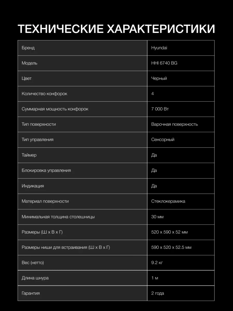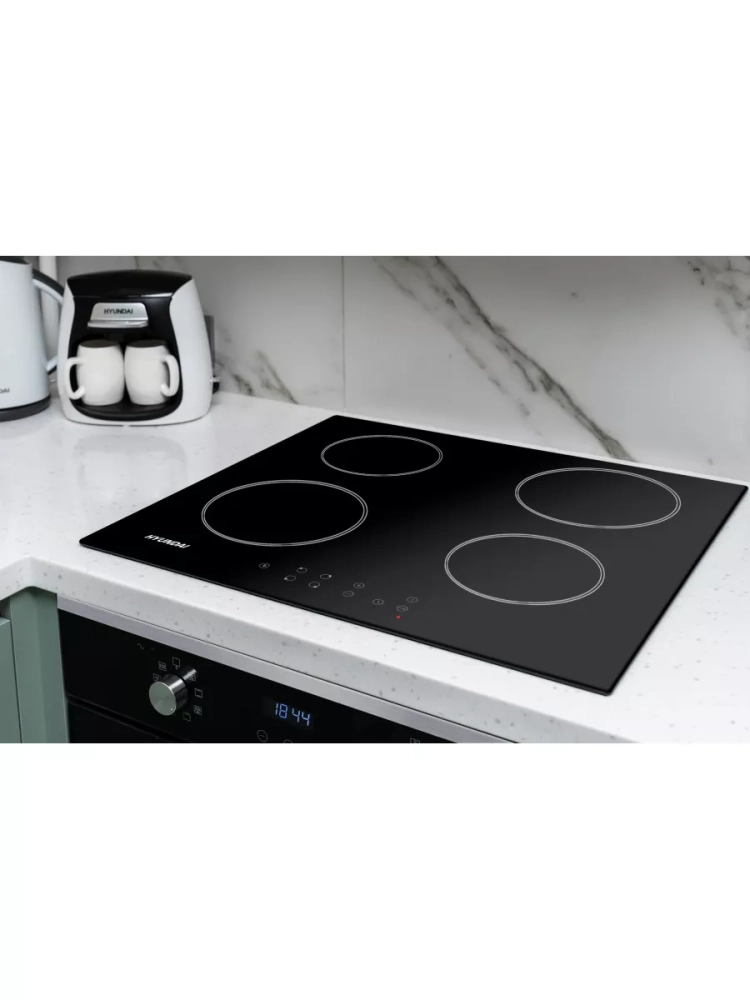 Индукционная варочная поверхность Hyundai HHI 6740 BG черный, независимая установка, материал поверхности стеклокерамика, индукционных конфорок 4