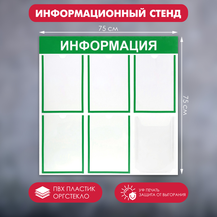 Информационный стенд «Информация» 6 карманов (5 плоских А4, 1 объемный А4), цвет зелёный