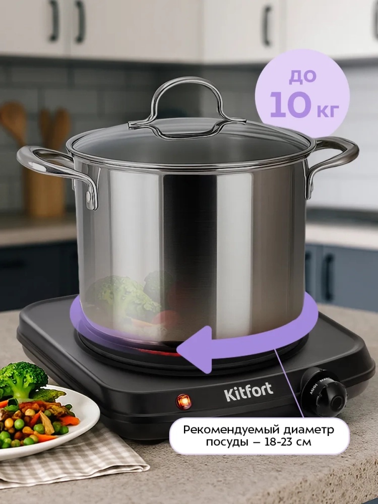 Рекомендуемый диаметр дна составляет 18–23 см, хотя возможно использовать посуду и других диаметров, вплоть до 7 см. Посуду с маленьким диаметром дна рекомендуется ставить в центр зоны нагрева. Плита КТ-5422 выдерживает вес не более 10 кг.