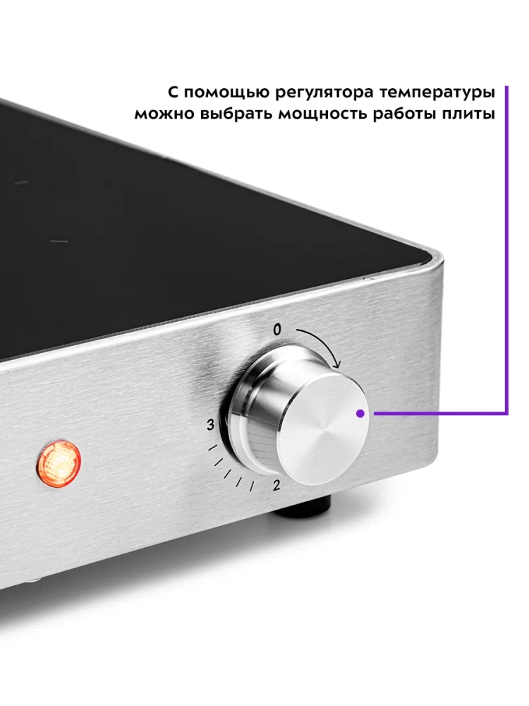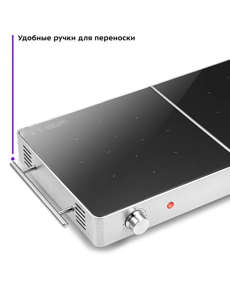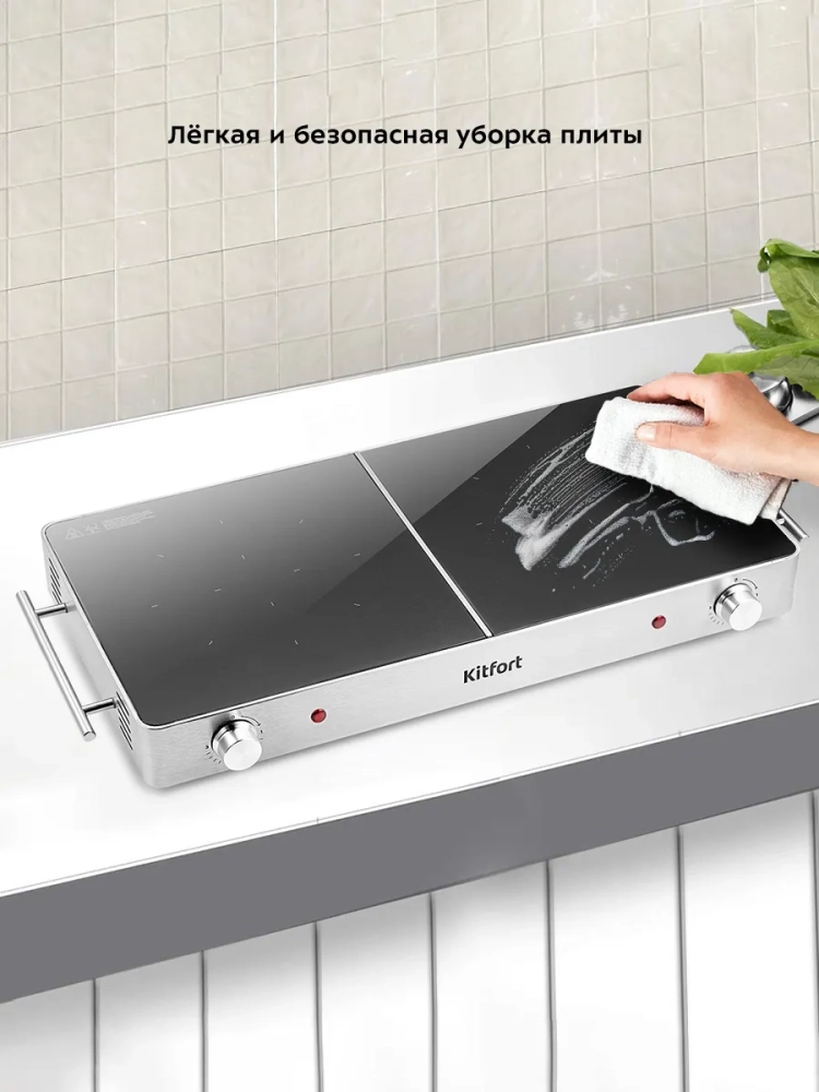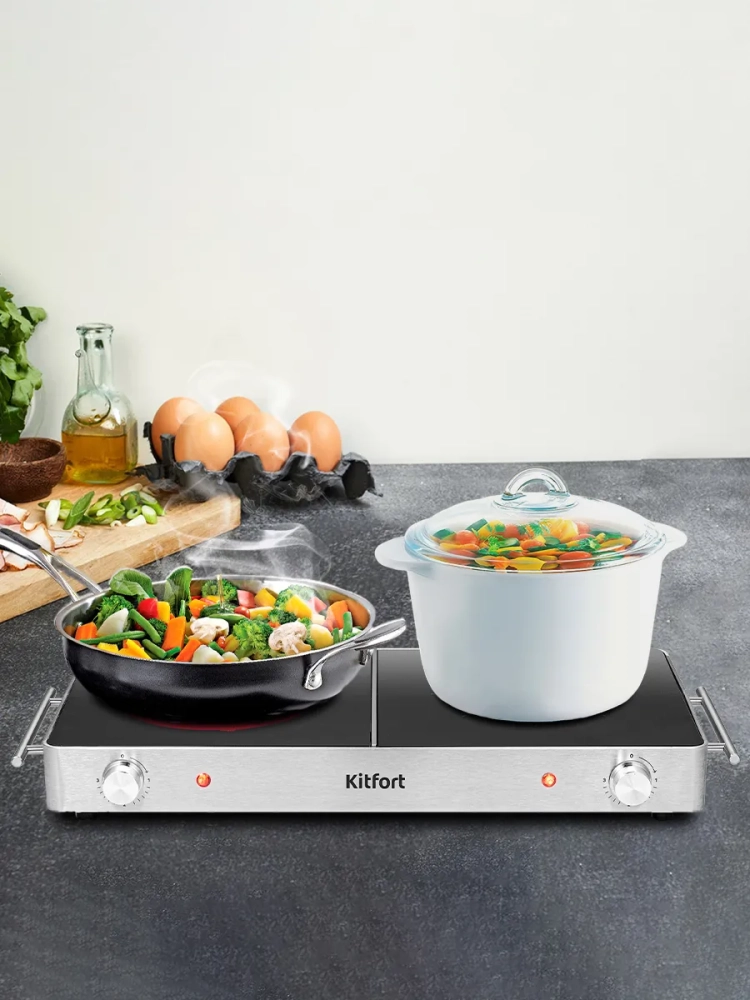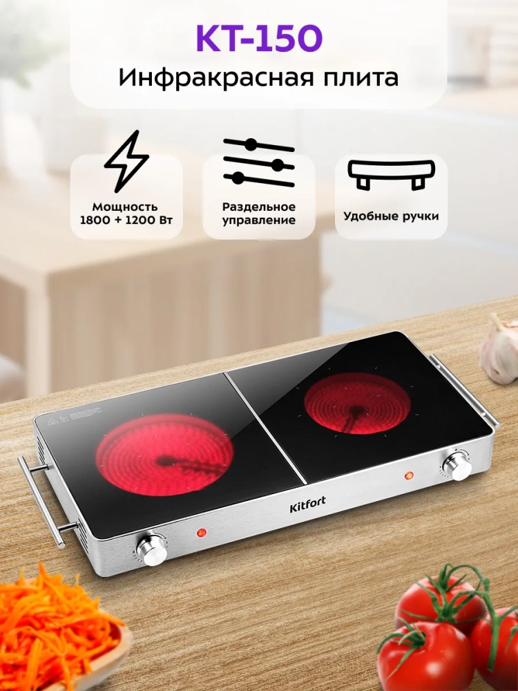 Инфракрасная плита Китфорт КТ-150 представляет собой один из новых экологически чистых кухонных приборов. Инфракрасная плита Kitfort КТ-150 соответствует требованиям государственного стандарта и подходит для приготовления любых блюд. Корпус плиты выполнен из нержавеющей стали, а поверхность из стеклокерамики. Плита обладает максимальной мощностью 1800 Вт для левой конфорки и 1200 Вт - для правой. Инфракрасная плита позволяет легко жарить блины и готовить практически любые блюда на любой посуде, в том числе на тонких алюминиевых сковородах. При нагреве и остывании плита может издавать звуки, похожие на потрескивание. Это звук материалов, которые расширяются или сжимаются при смене температуры. Это является нормальным явлением. Все это абсолютно нормальные шумы, характерные для технологии инфракрасного нагрева. Они не указывают на возникновение неисправностей. Для инфракрасной плиты подходит практически любая посуда. Однако при выборе посуды для инфракрасной плиты рекомендуется выбирать посуду с плоским дном. Рекомендуемый диаметр дна составляет 12-24 см, хотя возможно использовать посуду и других диаметров, вплоть до 7 см. Зона нагрева ограничивается диаметром инфракрасного нагревателя, который составляет 20 см для левой и 16,5 см для правой конфорки. Плита КТ-150 выдерживает вес не более 10 кг. Обратите внимание! При жарке сковорода сильно нагревается, поэтому не ставьте нагретую сковороду близко к краю стеклокерамической поверхности. То же самое касается не только сковороды, а любой посуды при высокотемпературной готовке, например, при жарке во фритюре.