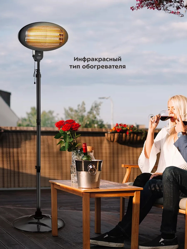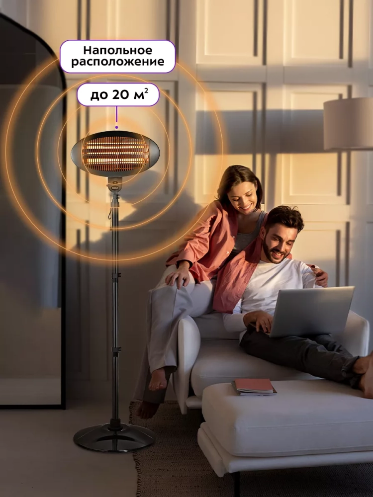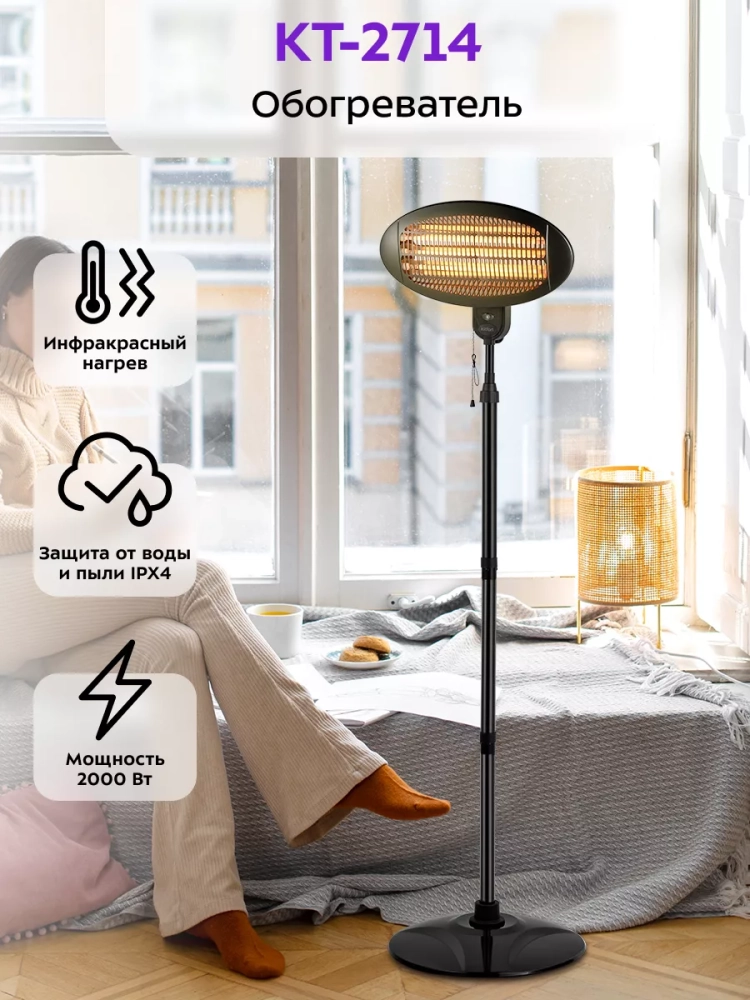 KT-2714 относится к инфракрасному типу обогревателей. Устройство предназначено для напольного и настенного размещения: в комплекте идет стойка с подставкой для размещения обогревателя на полу и крепежи для его установки на стену. Устройство подходит для размещения как внутри помещений, так и на улице.