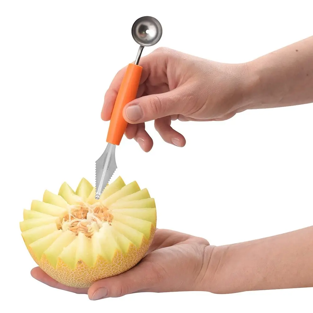Инструмент представляет собой карбовочной нож V-образной формы с одной стороны и ложку-нуазетку с другой стороны. Карбовочные ножи V-образной формы используются для вырезания канавок и выемок, а ложки-нуазетки - для выемки мякоти из крупных плодов, вырезания шариков и полусфер.