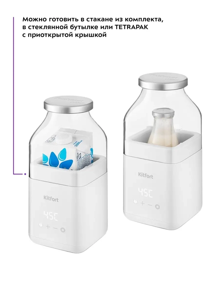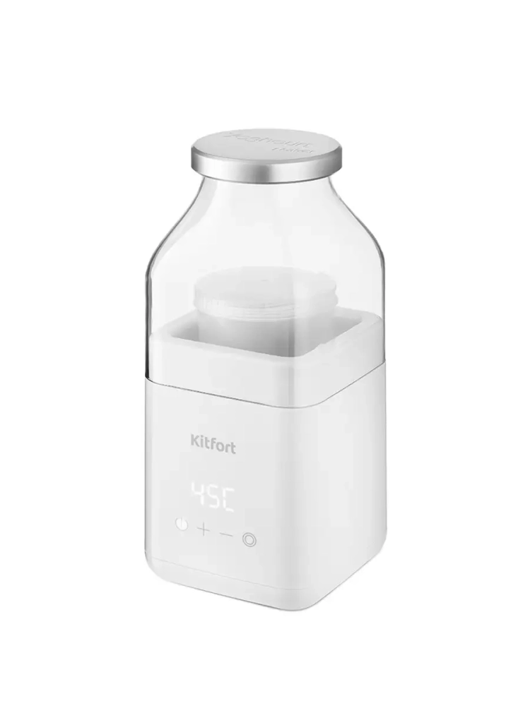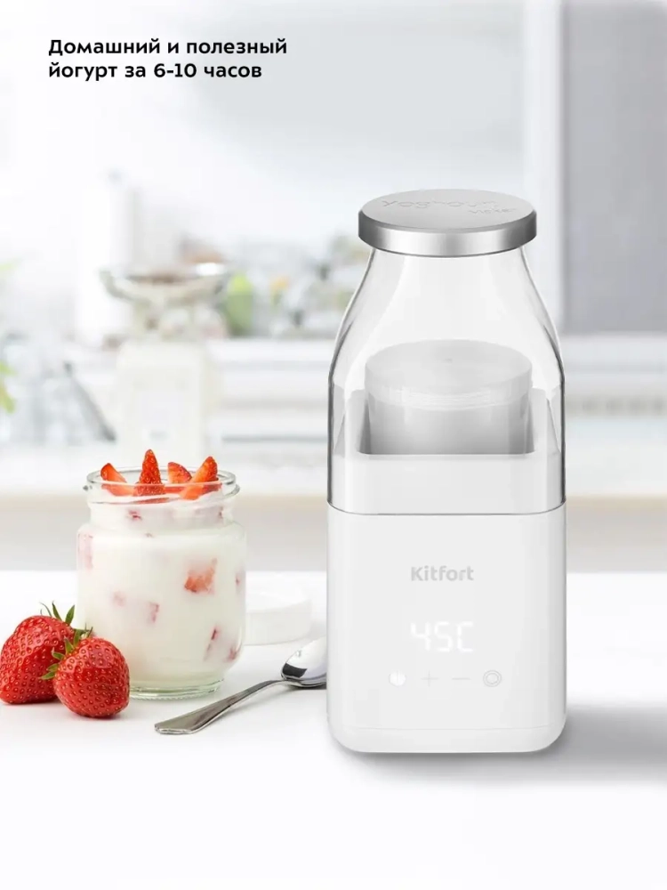Йогуртница Kitfort КТ-2053 предназначена для приготовления вкусного и полезного домашнего йогурта. Прибор укомплектован стаканом на 800 мл с крышкой, в котором готовый йогурт можно хранить в холодильнике. Йогуртница Китфорт равномерно нагревает стакан с ингредиентами, поддерживая заданную температуру. Длинная ложка в комплекте поможет перемешать содержимое стакана, а зажим для пакетов позволяет готовить йогурт сразу в магазинном тетрапаке. Приготовить йогурт в КТ-2053 очень легко. Смешайте молоко и закваску в стакане, установите стакан в йогуртницу, выставите время и температуру и нажмите кнопку включения. Соблюдайте рекомендации по приготовлению, и вы получите замечательный вкусный йогурт. Йогурт усваивается лучше, чем другие молочные продукты: даже те люди, которые страдают аллергией на белки молока, могут его употреблять, особенно это касается тех, кто не переносит лактозу. В натуральном йогурте содержатся жирные и органические кислоты, жиры, белки, углеводы; витамины А, С, РР, витамины группы В; минералы — калий, кальций, магний, натрий, сера, фосфор, хлор, железо, цинк, йод, медь, марганец, селен, хром, фтор, молибден, кобальт. Потребление йогурта улучшает работу кишечника. Кальция в йогурте очень много, и он не только поддерживает хорошее состояние костей и зубов, но и сохраняет здоровье слизистых оболочек. Источником кальция принято считать молоко, но его действительно могут пить не все, и к тому же кальций из молока усваивается хуже — оно не содержит тех бактериальных живых культур, которые есть в йогурте. Йогурт помогает усваивать минералы, витамины и укрепляет иммунитет: употребление 100—200 г йогурта ежедневно позволяет организму активнее вырабатывать интерферон; бактерии, содержащиеся в нем, поддерживают деятельность лейкоцитов, помогая им лучше защищать организм от инфекций. Йогурт насыщает организм молочными белками больше, чем само молоко: всего в 2 стаканах есть 1/5 часть суточной нормы белка для взрослого человека.
