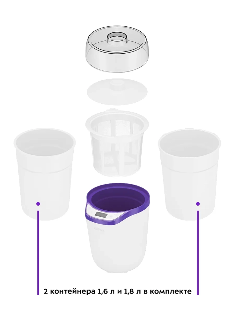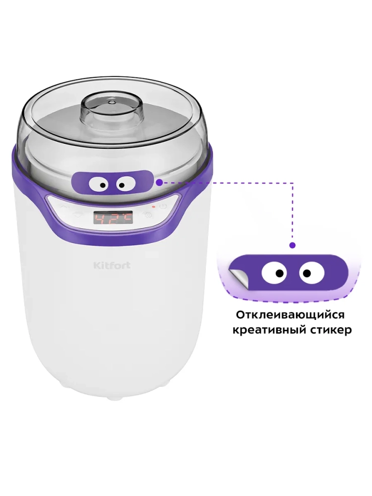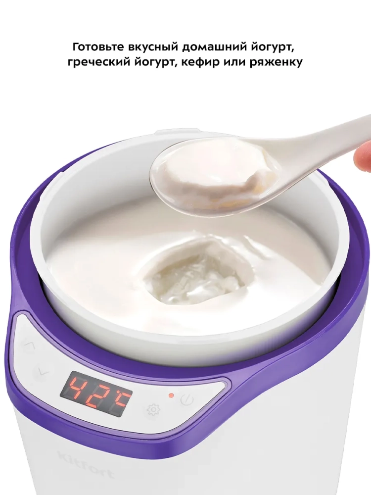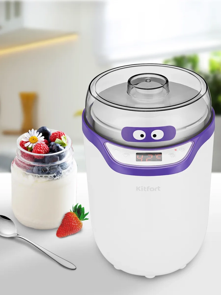 Йогуртница Kitfort КТ-2077 предназначена для приготовления вкусного и полезного домашнего йогурта. Прибор укомплектован двумя контейнерами на 1,8 л и 1,6 л с крышкой, в которых готовый йогурт можно хранить в холодильнике. В комплекте также есть сито для приготовления греческого йогурта, творога или сыра. Йогуртница равномерно нагревает контейнер с ингредиентами, поддерживая заданную температуру, и автоматически отключает нагрев по истечении заданного времени. Йогуртница закрывается крышкой, что обеспечивает более равномерное распределение тепла внутри. Йогуртница имеет 6 предустановленных программ и одну программу с возможностью установки времени приготовления с шагом 1 час в диапазоне 1-99 часов и температуры с шагом 1\*С в диапазоне 25-65 \*С.Приготовить йогурт и другие кисломолочные продукты в КТ-2077 очень легко. Смешайте молоко и закваску в контейнере, установите контейнер в йогуртницу, выберите подходящую программу или выставьте время и температуру, затем нажмите кнопку включения. Соблюдайте рекомендации по приготовлению, и вы получите замечательный вкусный йогурт, сметану, кефир или ряженку. Благодаря наличию сита в йогуртнице KT-2077 можно приготовить греческий йогурт. Греческий йогурт отличается от привычного йогурта тем, что от греческого йогурта отделяют сыворотку. В результате он обладает богатым вкусом, более густой, нежной кремовой текстурой. Греческий йогурт содержит на 30% меньше сахара и вдвое больше белка. Благодаря своему составу греческий йогурт лучше насыщает и медленнее переваривается.