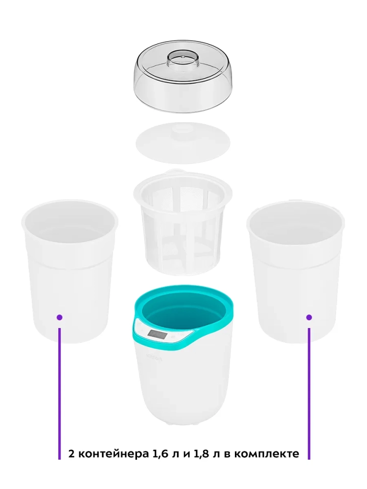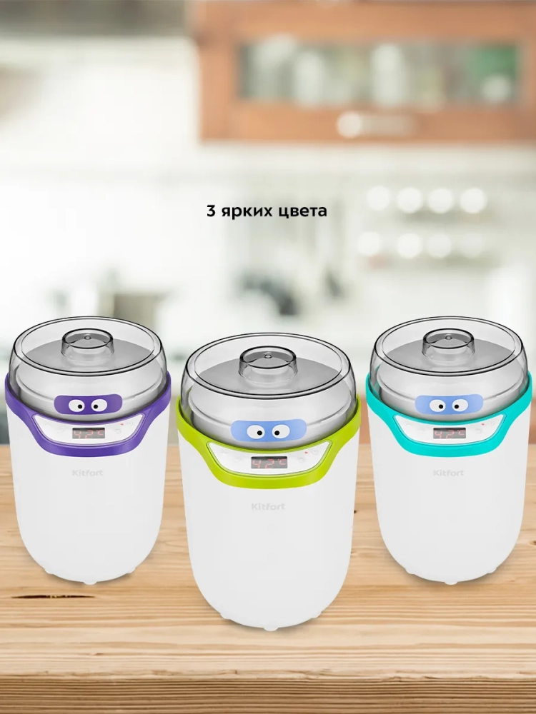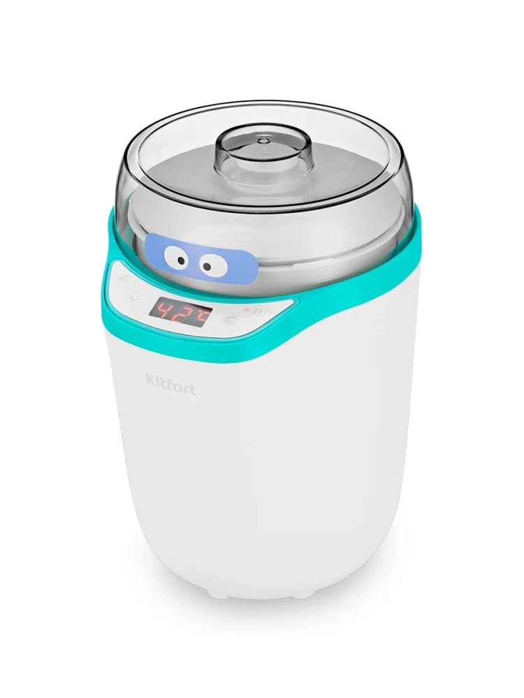 Йогуртница Kitfort КТ-2077 предназначена для приготовления вкусного и полезного домашнего йогурта. Прибор укомплектован двумя контейнерами на 1,8 л и 1,6 л с крышкой, в которых готовый йогурт можно хранить в холодильнике. В комплекте также есть сито для приготовления греческого йогурта, творога или сыра. Йогуртница равномерно нагревает контейнер с ингредиентами, поддерживая заданную температуру, и автоматически отключает нагрев по истечении заданного времени. Йогуртница закрывается крышкой, что обеспечивает более равномерное распределение тепла внутри. Йогуртница имеет 6 предустановленных программ и одну программу с возможностью установки времени приготовления с шагом 1 час в диапазоне 1-99 часов и температуры с шагом 1\*С в диапазоне 25-65 \*С.Приготовить йогурт и другие кисломолочные продукты в КТ-2077 очень легко. Смешайте молоко и закваску в контейнере, установите контейнер в йогуртницу, выберите подходящую программу или выставьте время и температуру, затем нажмите кнопку включения. Соблюдайте рекомендации по приготовлению, и вы получите замечательный вкусный йогурт, сметану, кефир или ряженку. Благодаря наличию сита в йогуртнице KT-2077 можно приготовить греческий йогурт. Греческий йогурт отличается от привычного йогурта тем, что от греческого йогурта отделяют сыворотку. В результате он обладает богатым вкусом, более густой, нежной кремовой текстурой. Греческий йогурт содержит на 30% меньше сахара и вдвое больше белка. Благодаря своему составу греческий йогурт лучше насыщает и медленнее переваривается.