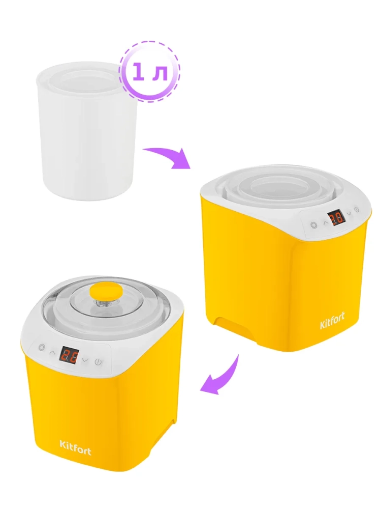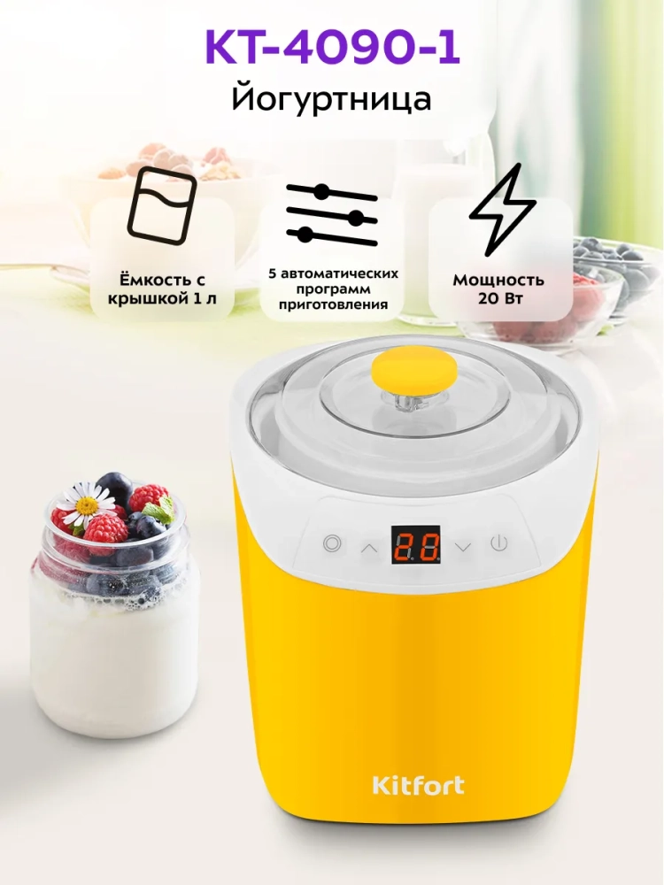 Йогуртница Kitfort КТ-4090 предназначена для приготовления вкусного и полезного домашнего йогурта. Прибор укомплектован пластиковой банкой на 1 литр с крышкой, в котором готовый йогурт можно хранить в холодильнике. Йогуртница равномерно нагревает банку с ингредиентами, поддерживая заданную температуру.