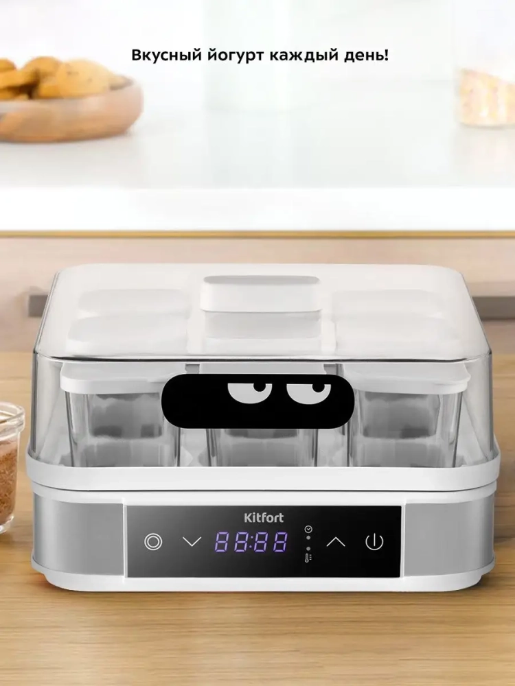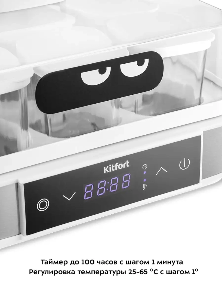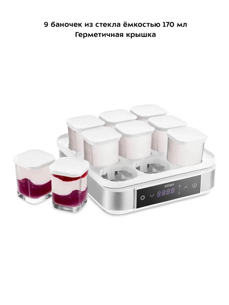Йогуртница Kitfort КТ-4096 предназначена для приготовления вкусного и полезного домашнего йогурта. Прибор укомплектован 9 стеклянными баночками по 170 мл каждая, в которых готовый йогурт можно хранить в холодильнике. Йогуртница равномерно нагревает баночки с ингредиентами, поддерживая заданную температуру. Приготовить йогурт в КТ-4090 очень легко. Смешайте молоко и закваску, разлейте смесь по баночкам и установите их в йогуртницу. Затем выставите время и температуру и нажмите на кнопку включения. Соблюдайте рекомендации по приготовлению и вы получите замечательный вкусный йогурт. Йогурт помогает усваивать минералы, витамины и укрепляет иммунитет: употребление 100-200 г йогурта ежедневно позволяет организму активнее вырабатывать интерферон; бактерии, содержащиеся в нем, поддерживают деятельность лейкоцитов, помогая им лучше защищать организм от инфекций. Йогурт насыщает организм молочными белками больше, чем само молоко: всего в 2 стаканах есть 1/5 часть суточной нормы белка для взрослого человека. С помощью йогуртницы можно готовить не только йогурт, но также разные натуральные продукты на основе молока и не только.