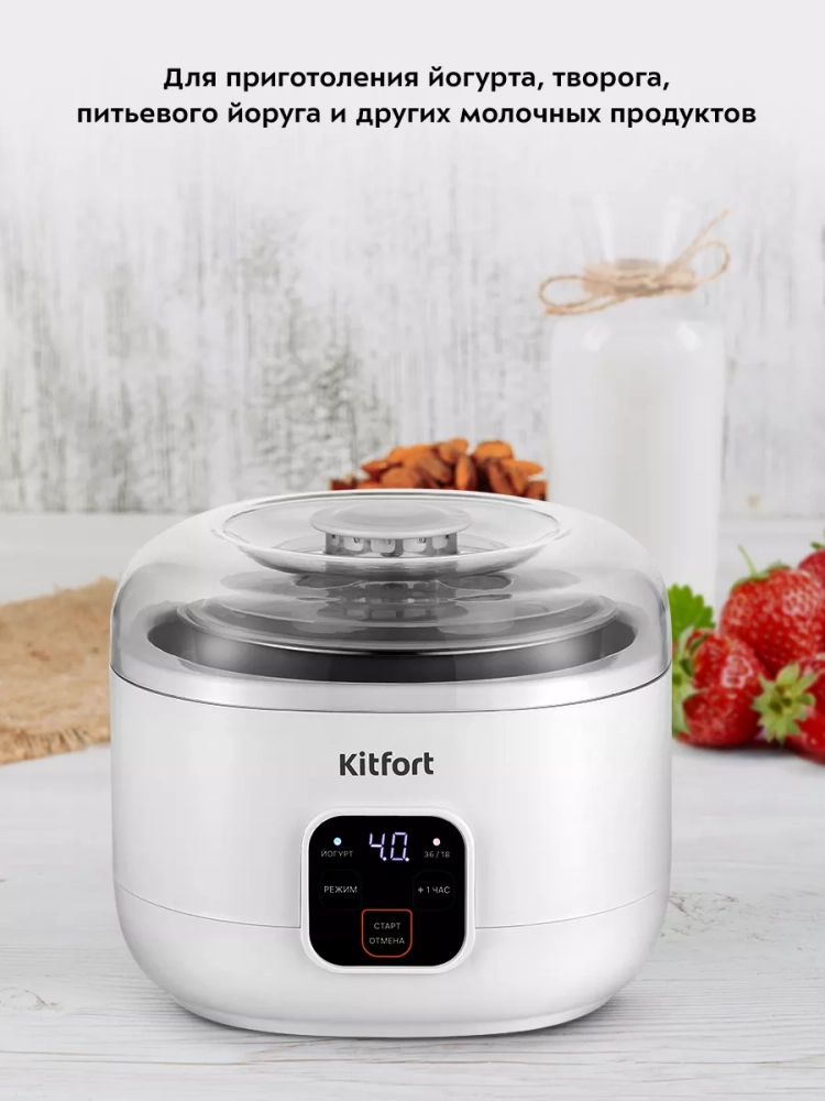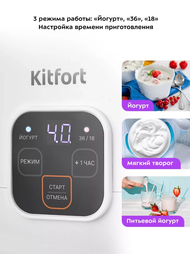 Йогуртница Kitfort КТ-6082 предназначена для приготовления вкусного и полезного домашнего йогурта, а также творога, питьевого йогурта или любого другого молочного продукта. В йогуртнице предусмотрены три режима приготовления, на каждом из которых вы можете настроить время работы.