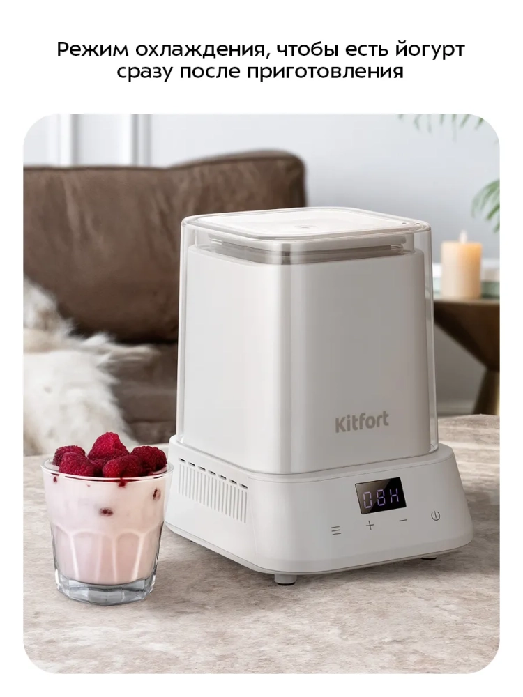 Приготовить йогурт в КТ-9836 очень легко. Смешайте молоко и закваску в чаше, установите ее в йогуртницу. Затем выберите температуру нагрева и время работы прибора или один из 7 автоматических режимов приготовления. После приготовления вы можете включить прибор в режиме охлаждения: вам не придется ставить йогурт в холодильник, и вы сможете его съесть сразу, достав из йогутницы. Соблюдайте рекомендации по приготовлению, и вы получите замечательный вкусный йогурт.