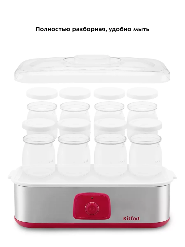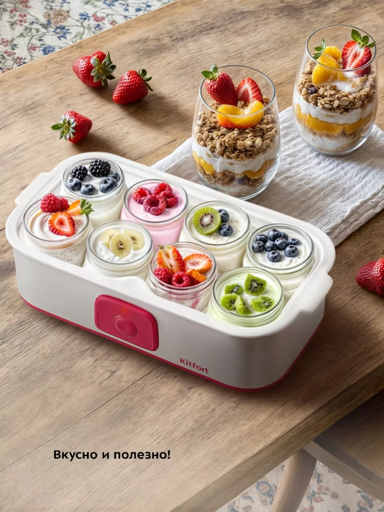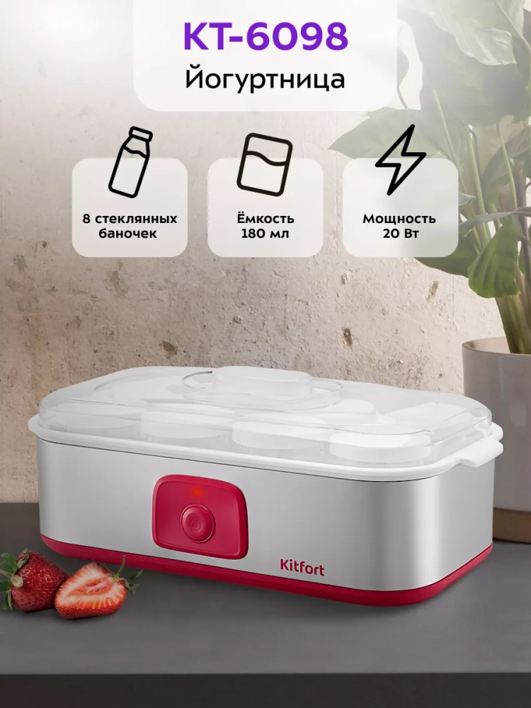 Йогуртница Kitfort КТ-6098 предназначена для приготовления вкусного и полезного домашнего йогурта. Прибор укомплектован 8 стеклянными баночками по 180 мл каждая, в которых готовый йогурт можно хранить в холодильнике. Йогуртница равномерно нагревает баночки с ингредиентами, поддерживая заданную температуру. Приготовить йогурт в КТ-6098 очень легко. Смешайте молоко и закваску, разлейте смесь по баночкам и установите их в йогуртницу. Затем нажмите на кнопку включения. Соблюдайте рекомендации по приготовлению и вы получите замечательный вкусный йогурт. Йогурт усваивается лучше, чем другие молочные продукты: даже те люди, которые страдают аллергией на белки молока, могут его употреблять, особенно это касается людей, не переносящих лактозу. В натуральном йогурте содержатся жирные и органические кислоты, жиры, белки, углеводы; витамины А, С, РР, витамины группы В; минералы — калий, кальций, магний, натрий, сера, фосфор, хлор, железо, цинк, йод, медь, марганец, селен, хром, фтор, молибден, кобальт. Потребление йогурта улучшает работу кишечника: живая и здоровая микрофлора не дает вредным и токсичным веществам «пробиваться» в кровь. Кальция в йогурте очень много, и он не только поддерживает хорошее состояние костей и зубов, но и сохраняет здоровье слизистых оболочек. Источником кальция принято считать молоко, но его действительно могут пить не все, и к тому же кальций из молока усваивается хуже — оно не содержит тех бактериальных живых культур, которые есть в йогурте. Йогурт помогает усваивать минералы, витамины и укрепляет иммунитет: употребление 100–200 г йогурта ежедневно позволяет организму активнее вырабатывать интерферон; бактерии, содержащиеся в йогурте, поддерживают деятельность лейкоцитов, помогая им лучше защищать организм от инфекций. Йогурт насыщает организм молочными белками больше, чем само молоко: всего в 2 стаканах йогурта есть 1/5 часть суточной нормы белка для взрослого человека.