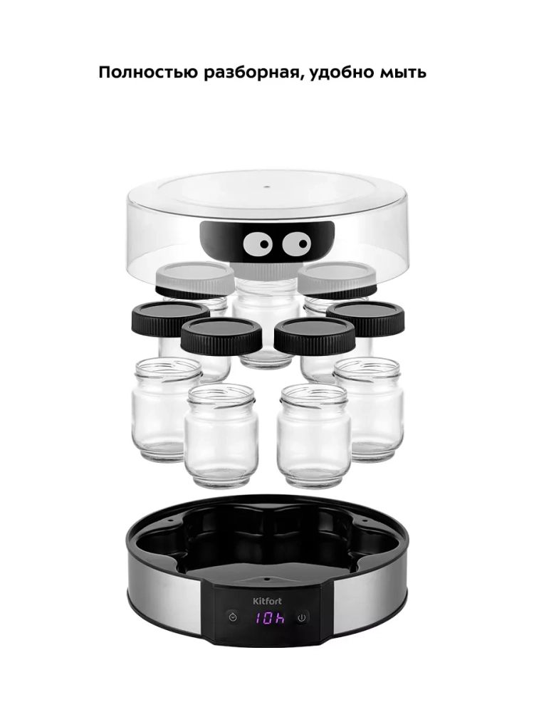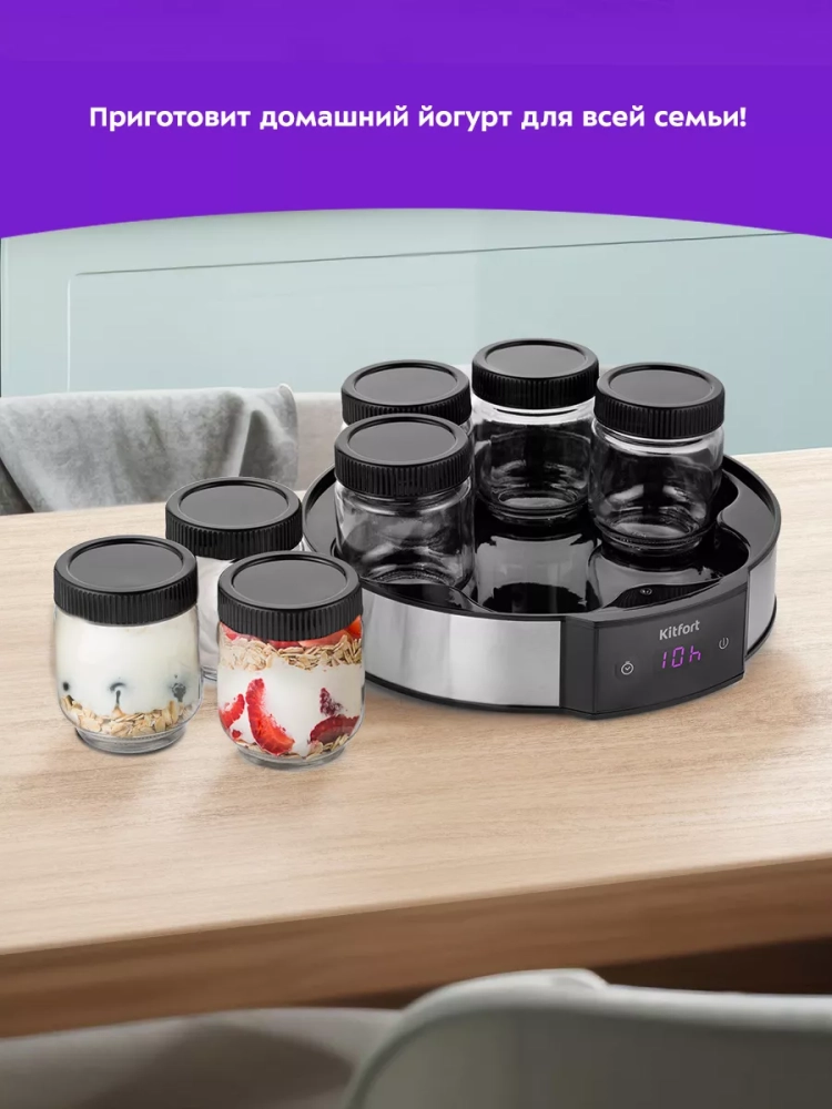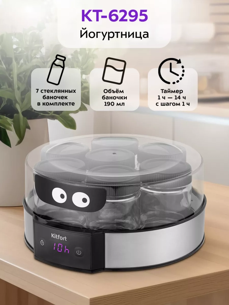 Йогуртница Kitfort КТ-6295 предназначена для приготовления вкусного и полезного домашнего йогурта. Прибор укомплектован 7 стеклянными баночками по 190 мл каждая, в которых готовый йогурт можно хранить в холодильнике. Йогуртница равномерно нагревает баночки с ингредиентами, поддерживая заданную температуру.