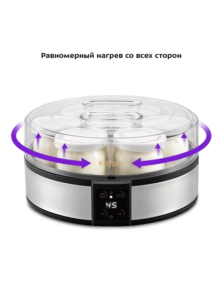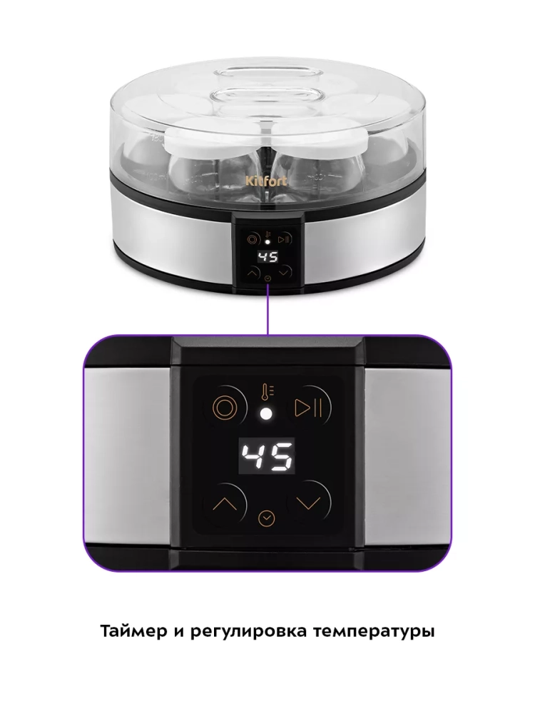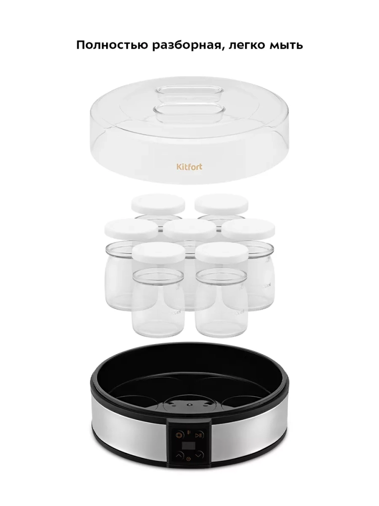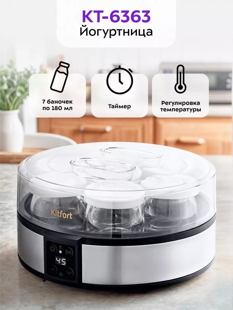 Йогуртница Kitfort КТ-6363 предназначена для приготовления вкусного и полезного домашнего йогурта. Прибор укомплектован 7 стеклянными баночками по 190 мл каждая, в которых готовый йогурт можно хранить в холодильнике. Йогуртница равномерно нагревает баночки с ингредиентами, поддерживая заданную температуру.