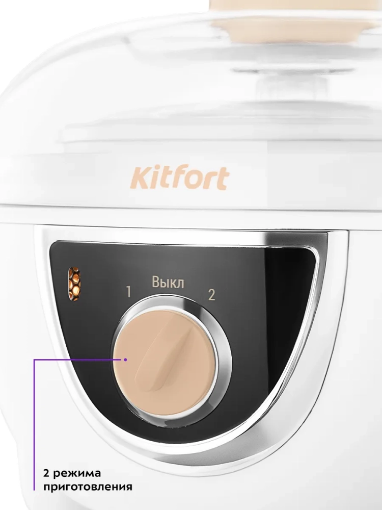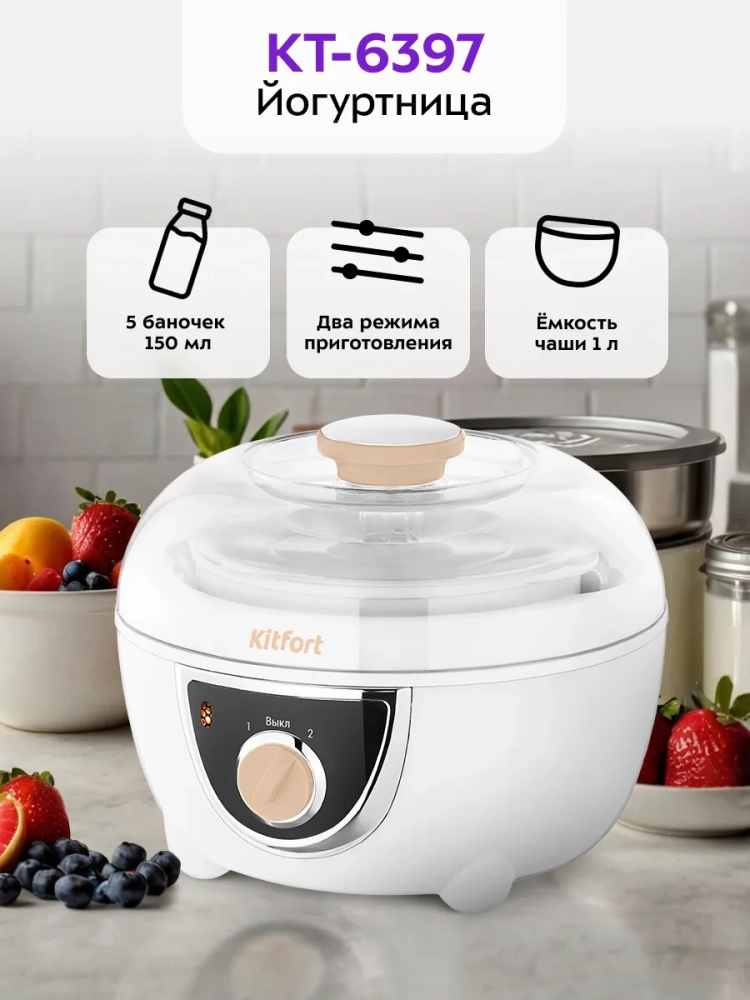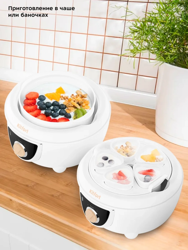 Йогуртница Kitfort КТ-6397 предназначена для приготовления вкусного и полезного домашнего йогурта. Прибор укомплектован чашей емкостью 1 литр с пластиковой крышкой, а также 5 пластиковыми баночками емкостью 150 мл каждая. Такая комплектация делает прибор более универсальным: вы можете приготовить йогурт в баночках, чтобы сразу разделить его на порции, или в чаше, в которой можно смешивать ингредиенты для йогурта, не используя дополнительную посуду. Готовый йогурт можно хранить в холодильнике прямо в чаше или баночках. Йогуртница равномерно нагревает чашу или баночки с ингредиентами, поддерживая необходимую температуру.
