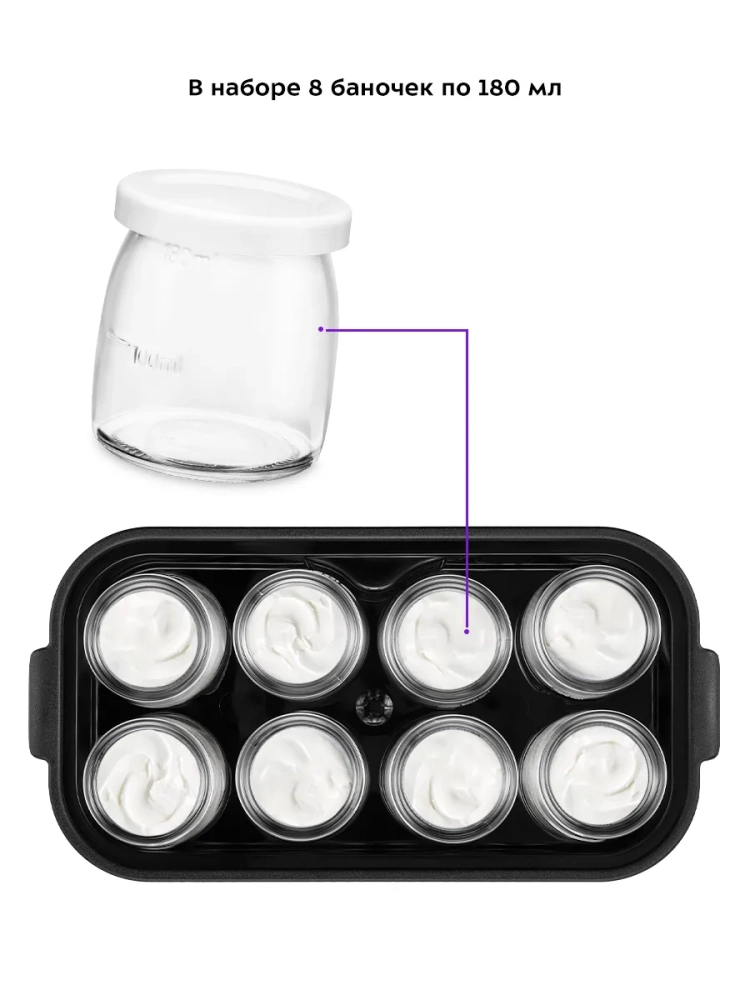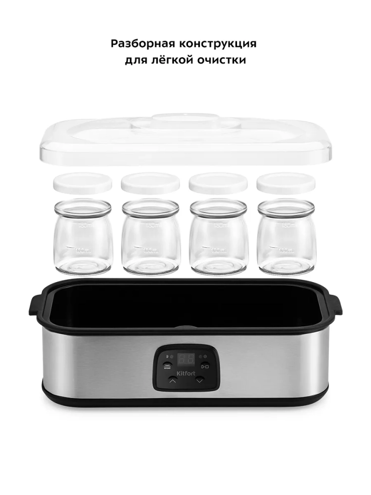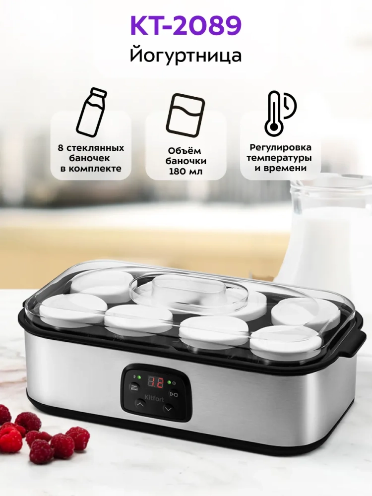 Йогуртница Kitfort КТ-2089 с электронным управлением предназначена для приготовления вкусного и полезного домашнего йогурта. Она компактная, но вмещает 8 стеклянных баночек по 180 мл каждая, в которых готовый йогурт можно хранить в холодильнике. Корпус йогуртницы равномерно нагревает баночки с ингредиентами, поддерживая заданную температуру. KT-2089 имеет панель управления для установки времени и температуры приготовления и светодиодный дисплей для отображения настроек. Об окончании приготовления йогурта известит звуковой сигнал.