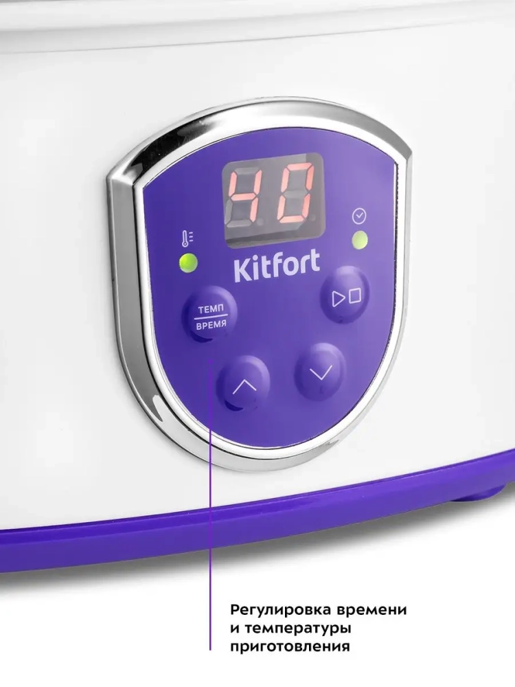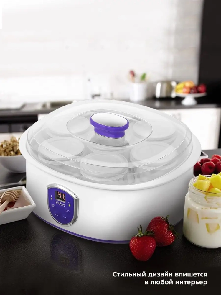 Электрическая йогуртница с таймером и баночками KT-2088 от Kitfort — ваш надежный помощник в создании вкусного и полезного домашнего йогурта. Эта модель, оснащенная электронным управлением, позволяет легко приготовить натуральный кисломолочный продукт. В комплект входят 7 стеклянных баночек по 180 мл каждая, что делает процесс приготовления удобным и практичным. Готовый йогурт можно хранить в холодильнике благодаря плотно закрывающимся крышкам. Йогуртница равномерно нагревает баночки с ингредиентами, поддерживая оптимальную температуру для достижения наилучшего результата. Панель управления позволяет установить время и температуру приготовления, а светодиодный дисплей отображает текущие настройки. Звуковой сигнал таймера известит вас о завершении процесса. Создавайте натуральные кисломолочные продукты с высоким содержанием витаминов и минералов: кальция, калия и магния. Потребление такого йогурта улучшает работу кишечника благодаря живой микрофлоре, включая бифидумбактерин, которая препятствует проникновению вредных веществ в кровь. Натуральный йогурт из банок из прочного стекла насыщает организм молочными белками больше чем молоко: всего два стакана содержат пятую часть суточной нормы белка взрослого человека. Йогурты усваиваются лучше других молочных продуктов благодаря наличию бактериальных культур — это особенно важно для людей с непереносимостью лактозы или аллергией на белки молока. Крышка каждой баночки обеспечивает сохранность продукта при транспортировке или хранении в холодильнике. С помощью этой йогуртницы от Китфорт вы сможете ежедневно наслаждаться свежим домашним кисломолочным продуктом без лишних усилий.