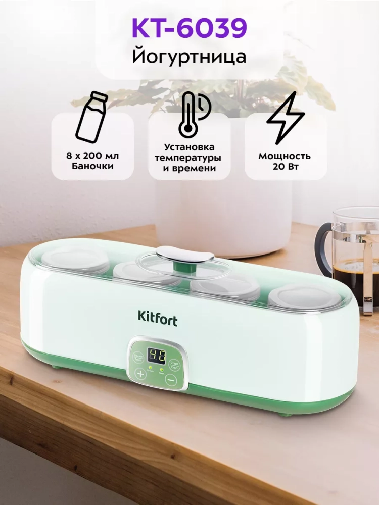 Йогуртница Kitfort КТ-6039 — это превосходное многофункциональное решение для тех, кто ценит домашний йогурт. Эта кухонная техника с электронным управлением позволяет легко приготовить вкусный и полезный продукт в домашних условиях. Компактная овальная форма устройства вмещает четыре стеклянные баночки, что делает хранение готового йогурта удобным и практичным. Баночка из стекла обеспечивает безопасное хранение продукта, а крышка плотно закрывает её, предотвращая попадание посторонних запахов. Электрическая йогуртница равномерно нагревает банки с ингредиентами, поддерживая оптимальную температуру для приготовления. Панель управления бытового прибора позволяет установить время и температуру приготовления с помощью таймера и других средств, а светодиодный дисплей гаджета отображает все настройки процесса. По окончании приготовления раздаётся звуковой сигнал, оповещающий о готовности вашего йогурта. Процесс создания домашнего лакомства прост: смешайте молоко и закваску для йогурта — через некоторое время вы получите замечательный живой продукт, мягкий как хлопок! Йогуртница Kitfort КТ-6039 станет незаменимым помощником на вашей кухне благодаря своей функциональности и простоте использования. Эта электро техника не только облегчает процесс создания натурального продукта без консервантов и добавок, но также экономит ваше время благодаря автоматизации процесса. Хранение приготовленного йогурта в холодильнике возможно прямо в баночках из комплекта. Kitfort КТ-6039 — это надежность от проверенного производителя техники для кухни Китфорт. Пробиотик можно добавить по желанию для улучшения вкуса или пользы вашей смеси.