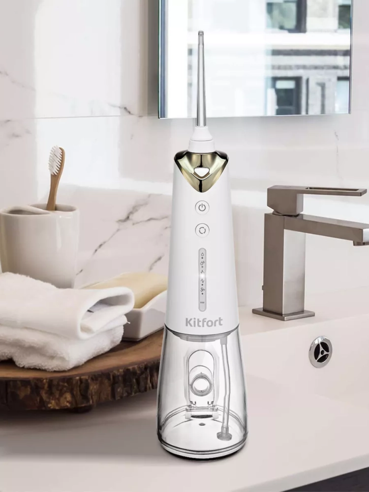 Ирригатор KT-2942 — это прибор для ухода за полостью рта. Он очень прост в использовании: налейте воду (или специальный раствор для полоскания зубов) в резервуар, выберите подходящий вам режим и начинайте очистку. Модель Kitfort KT-2942 является портативным ирригатором, его можно брать с собой в путешествия или на работу — он с легкостью поместится в небольшую сумку. У ирригатора 2 кнопки — кнопка включения/выключения и кнопка «Режим». У прибора всего 5 режимов работы — «Мягкий», «Нормальный», «Вручную», «Импульсный» и «Смешанный». Если вы до этого не пользовались ирригатором, начните с самого слабого режима «Мягкий», т.к. неподготовленные и чувствительные десны могут начать кровоточить из-за сильного и тонкого потока воды. Когда десны привыкнут и окрепнут, вы можете переходить на более сильные режимы. При работе на корпусе ирригатора светится индикатор выбранного режима. Прибор автоматически отключается после 2 минут использования. У ирригатора есть резервуар для воды емкостью 280 мл, чего хватает для тщательной обработки полости рта.В комплекте к ирригатору идут насадки: две классические струйные насадки, насадка для удаления зубного камня и налета из-под линии десны, насадка с щеточкой для удаления налета и насадка для чистки языка. Заряжать прибор с помощью шнура USB Type-C можно от компьютера, пауэрбанка или блока питания. В профилактических целях ирригатор нужен каждому взрослому человеку. Ирригатор не заменяет собой зубную щетку, он является частью комплексного ухода за полостью рта. Комплексный уход для вас должен подобрать ваш лечащий врач-стоматолог, обычно уход включает в себя: ирригацию, чистку зубов зубной щеткой и ершиками, полоскание рта ополаскивателем и использование зубной нити, если это необходимо. Этот прибор рекомендуют стоматологи во всем мире.