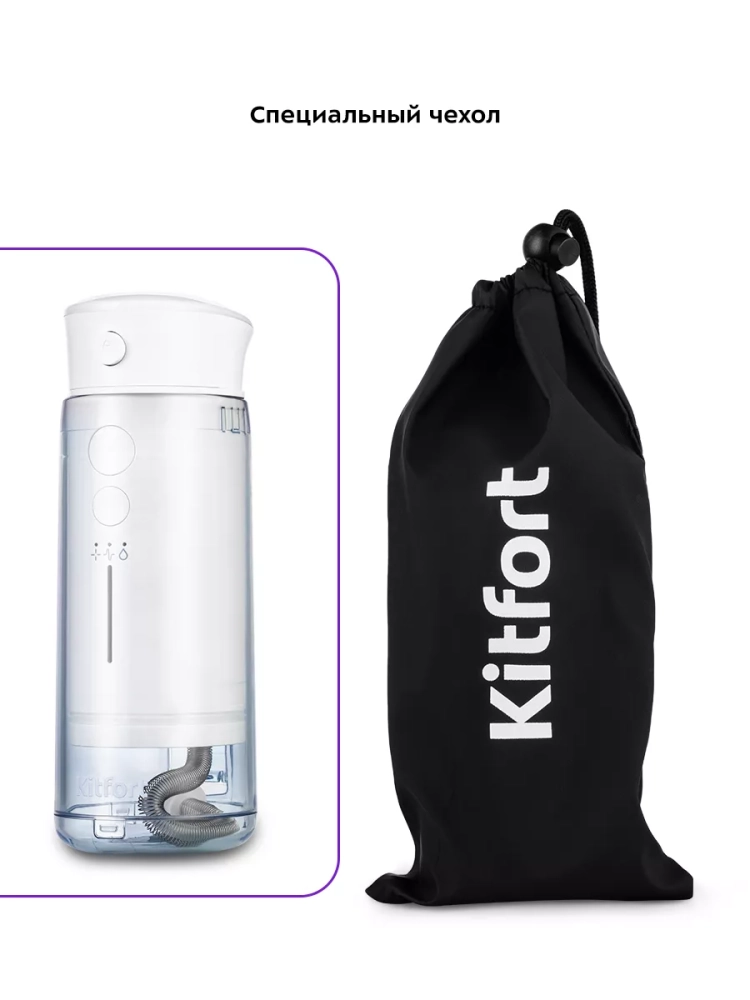 Модель Kitfort KT-2985 является портативным ирригатором, его можно брать с собой в путешествия или на работу — он с легкостью поместится в небольшую сумку. В комплекте есть чехол, в котором удобно хранить и перевозить устройство.