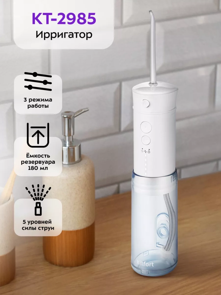 Ирригатор Kitfort KT-2985 — это прибор для ухода за полостью рта. Он очень прост в использовании: налейте воду (или специальный раствор для ирригаторов) в резервуар, выберите подходящий вам режим и начинайте очистку.