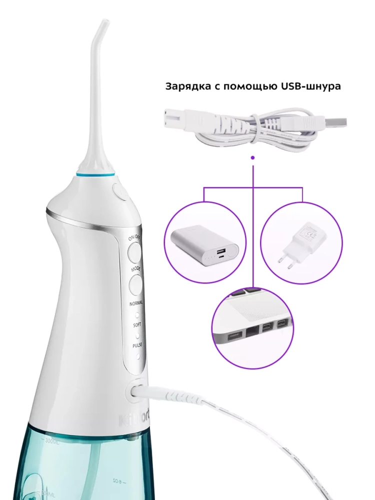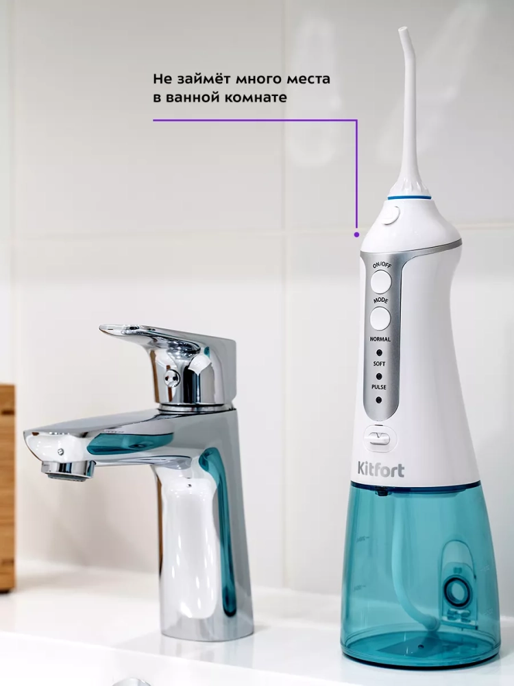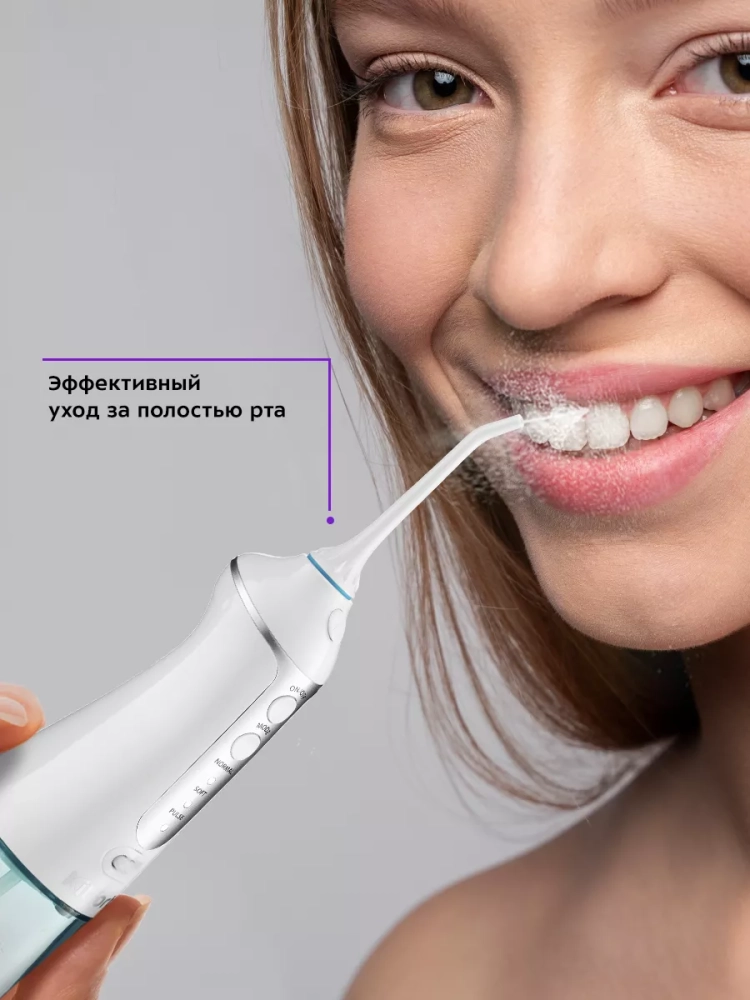 У ирригатора три режима работы — «Normal», «Soft» и «Massage». Прибор автоматически отключается после 2 минут использования.