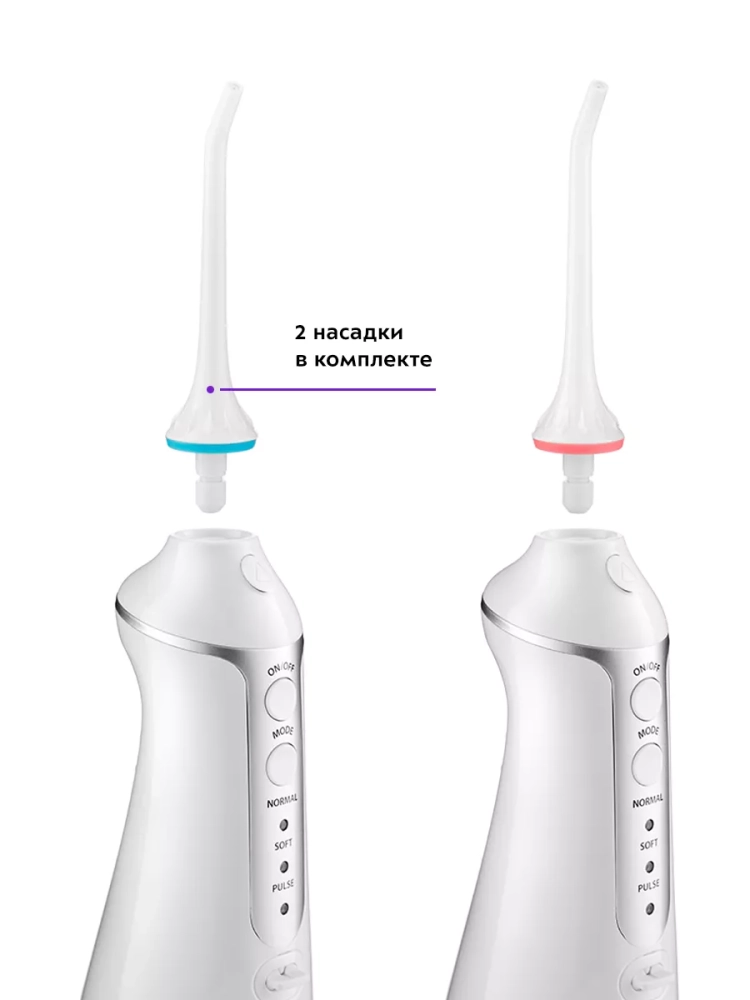 В комплекте к ирригатору идут две классические струйные насадки, например, для двух членов семьи.