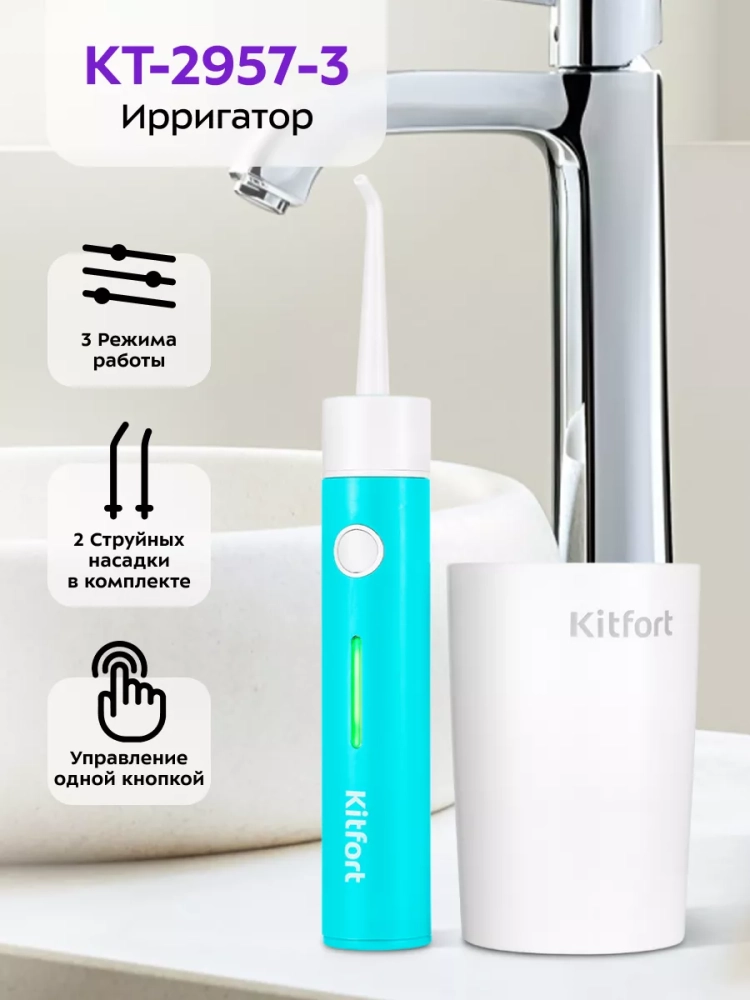 Ирригатор Kitfort KT-2957 — важное вспомогательное устройство для поддержания гигиены полости рта. Он позволяет справиться с налетом и остатками пищи в труднодоступных местах, например, межзубном пространстве и пародонтальных карманах.