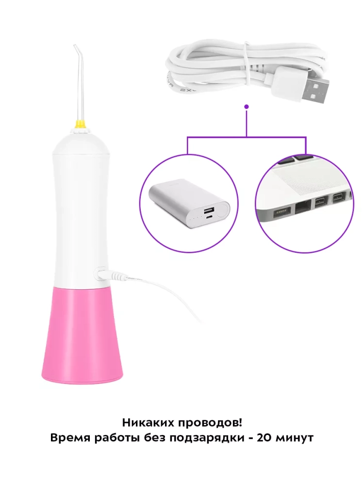Заряжать прибор можно с помощью USB-шнура от компьютера, пауэрбанка или блока питания. При полном заряде ирригатор работает до 20 мин. У прибора есть автоматическое отключение после 2 минут использования.