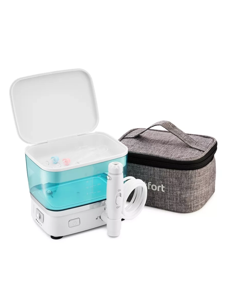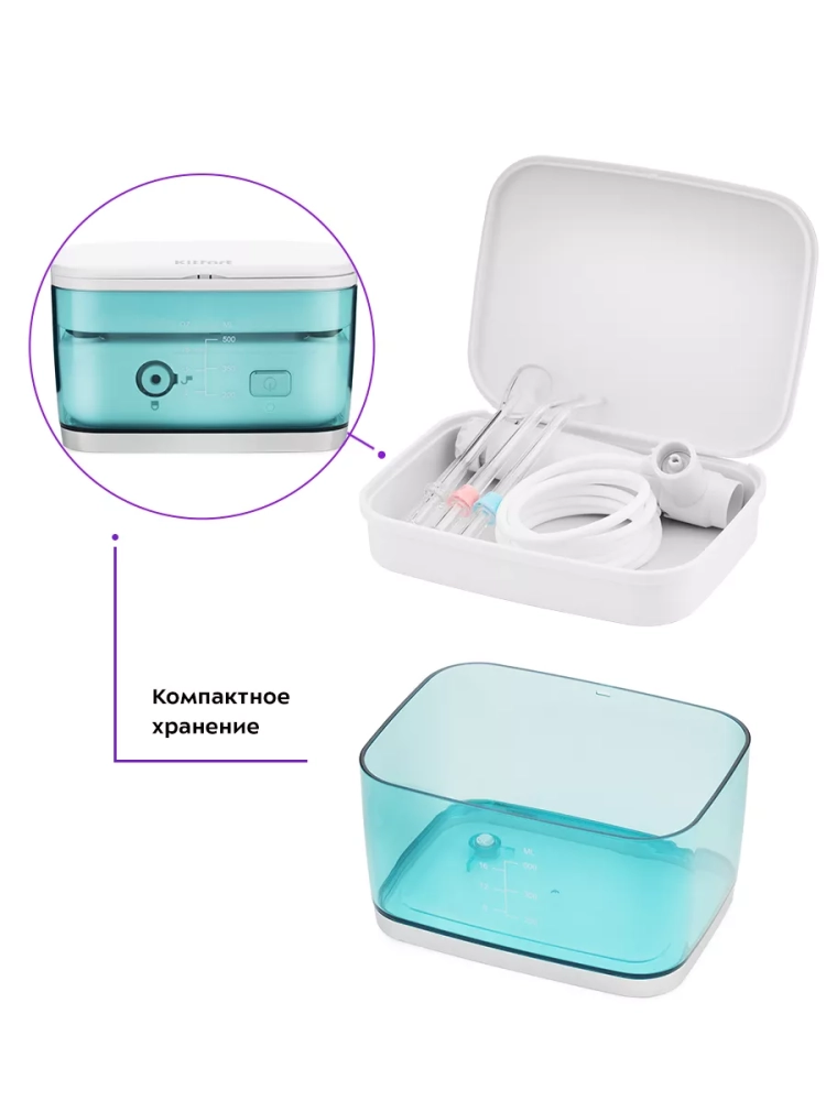 Модель Kitfort KT-2907 является стационарным ирригатором, но из-за своей компактности ирригатор можно назвать портативным. Вы можете положить его в сумку, она идет в комплекте, и брать ирригатор с собой на работу или в путешествия.
