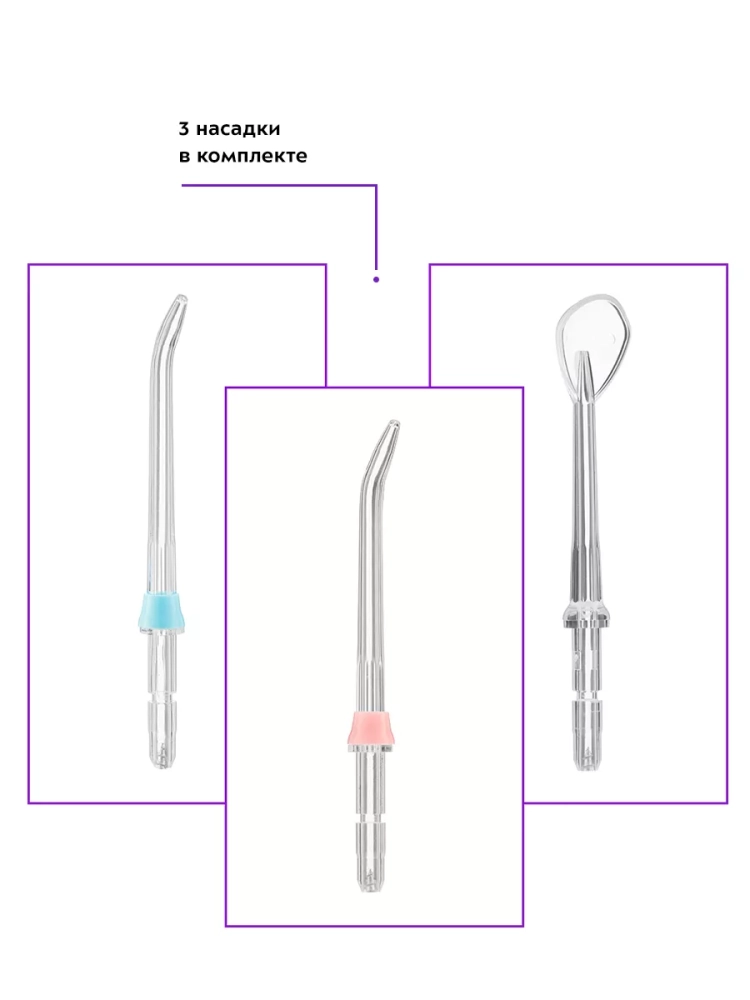 В комплекте к ирригатору идут 3 насадки: 2 классические струйные насадки и насадка для чистки языка. Для хранения насадок предусмотрен специальный контейнер, который также является крышкой резервуара для воды. Это очень удобно, ведь если насадки будут всегда находиться в одном месте — они не потеряются.