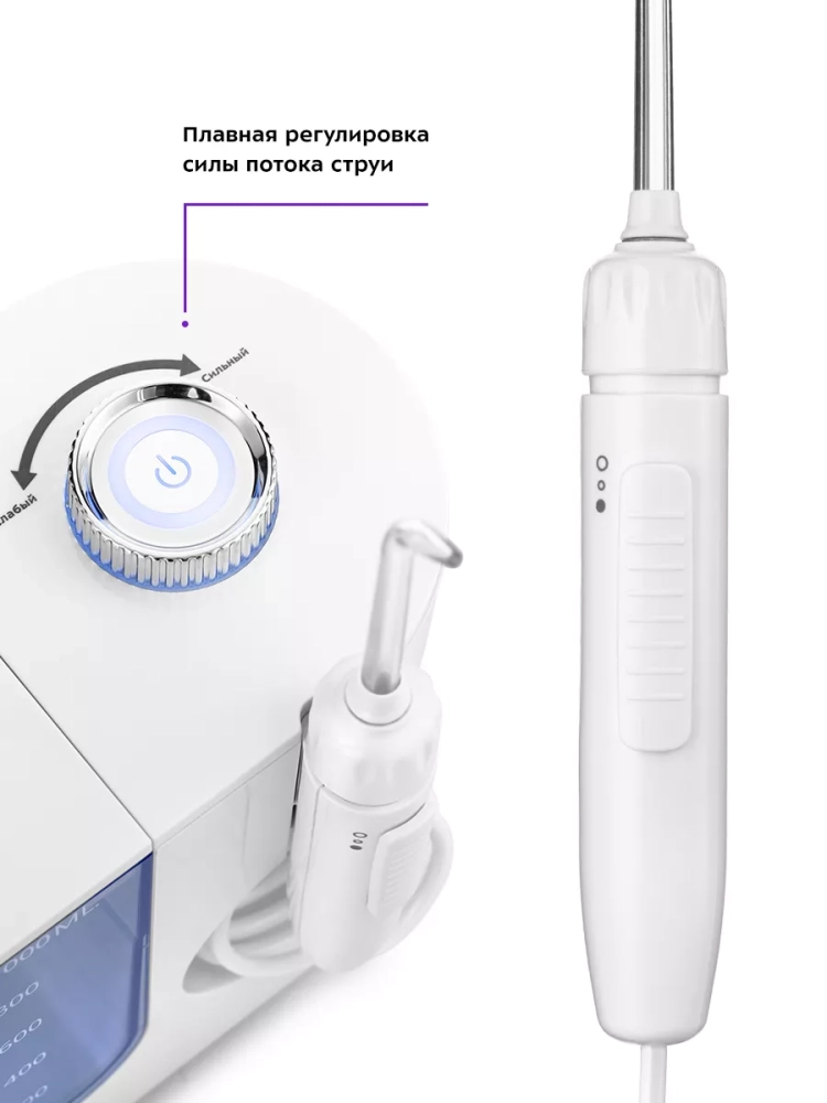 У ирригатора сверху на корпусе есть кнопка включения, которая также является регулятором потока.