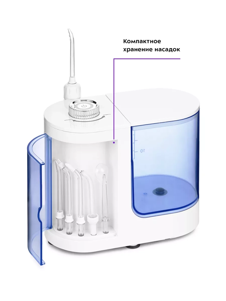 В комплекте к ирригатору идут 6 насадок: 2 классические струйные насадки, насадка для удаления зубного камня и налета из-под линии десны, насадка для ортодонтических конструкций, насадка с щеточкой для удаления налета, насадка для чистки языка. Для хранения наиболее используемых насадок предусмотрен специальный отсек, который встроен в корпус сбоку и закрывается дверцей.