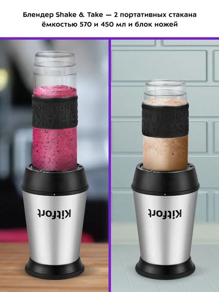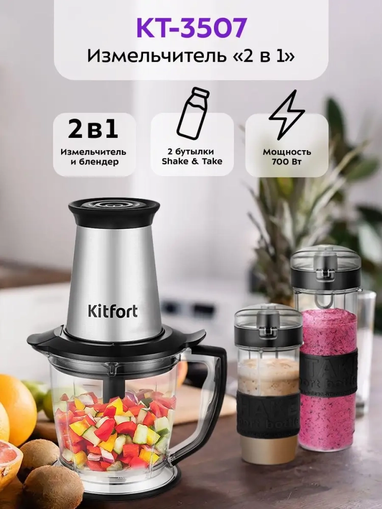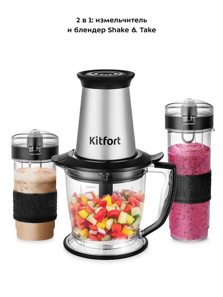 Измельчитель «2 в 1» Kitfort КТ-3507 сочетает в себе функции двух устройств: измельчителя и блендера Shake & Take (шейк энд тэйк) с двумя портативными бутылками.