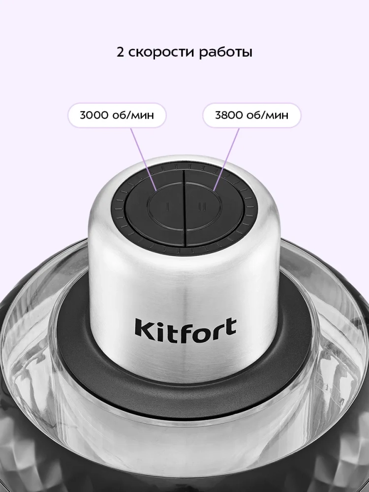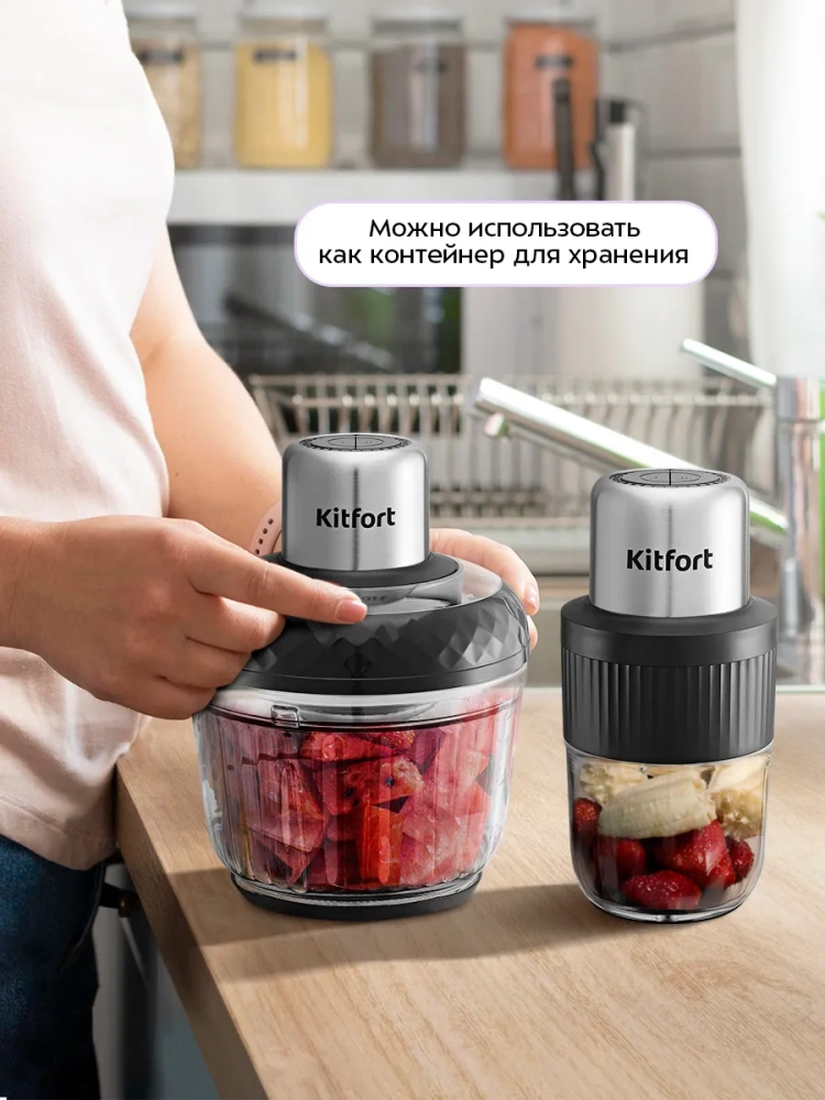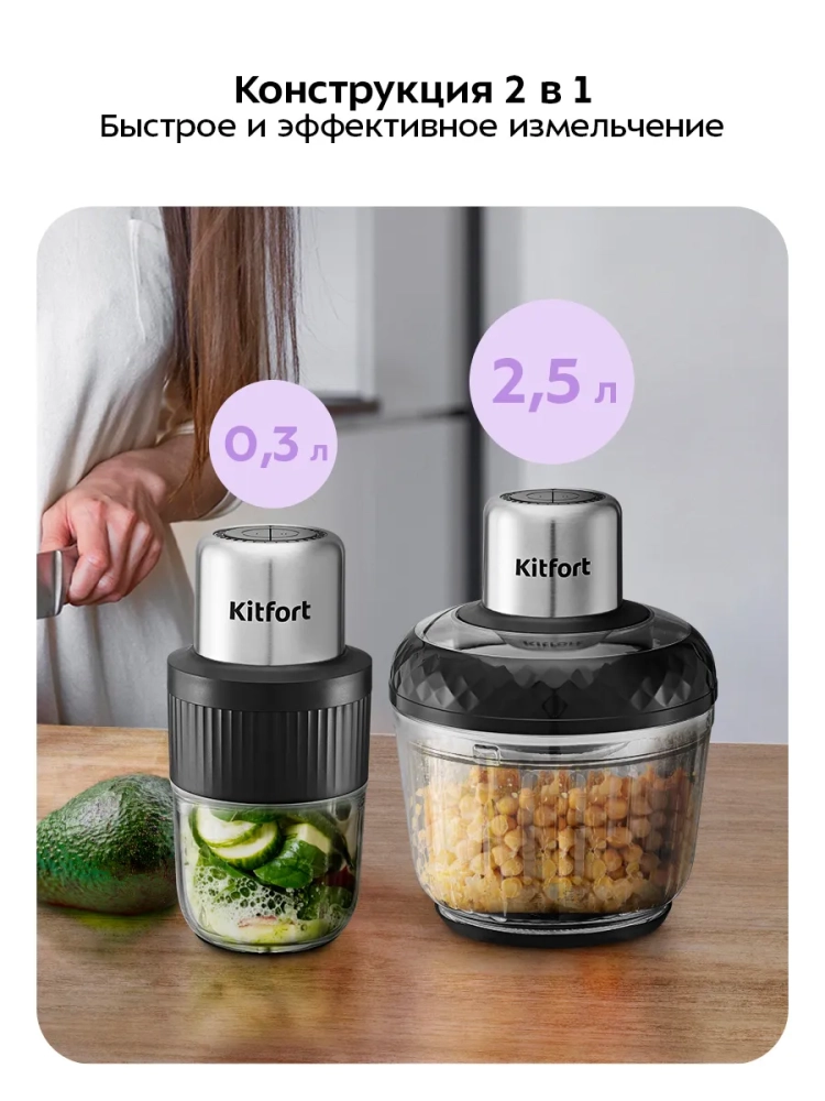 Измельчитель «2 в 1» Kitfort КТ-3522 — устройство для быстрого измельчения мяса, твердого сыра, овощей, фруктов, трав, чеснока, ягод и многих других продуктов. Блок ножей измельчает ингредиенты практически по всей высоте чаши, поэтому процесс измельчения пищи происходит намного быстрее, чем при использовании ручных кухонных приспособлений. Любой салат будет готов за считанные минуты. Все, что потребуется — подготовить продукты для резки и следить за степенью измельчения. В комплекте предусмотрены две стеклянные чаши емкостью 0,3 и 2,5 л.