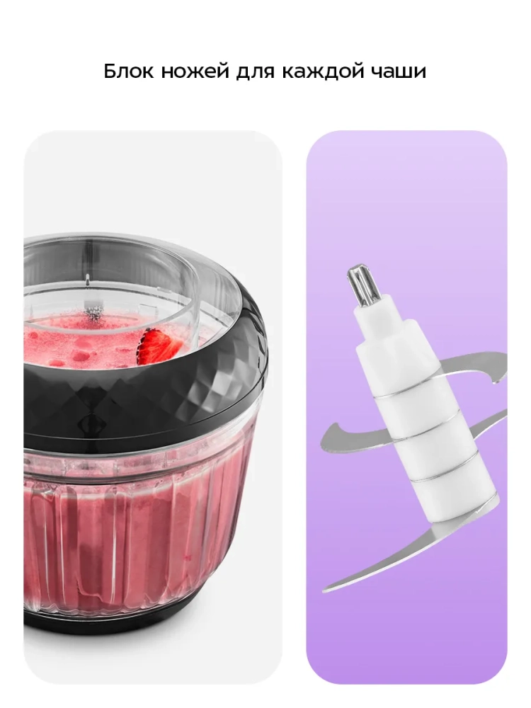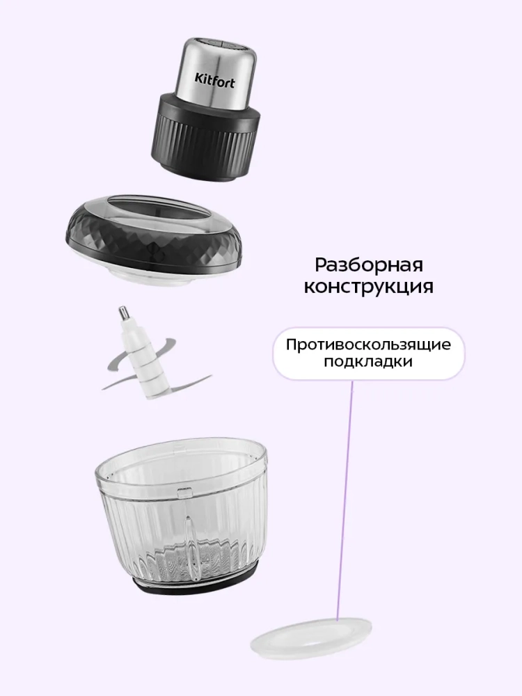 Прозрачные стенки чаш измельчителя позволяют наблюдать за процессом и контролировать степень измельчения. Обе чаши можно закрыть крышками и использовать для хранения продуктов в холодильнике. Противоскользящие подкладки снизу чаш уменьшают скольжение прибора по столу, а также снижают вибрацию и уровень шума при работе.