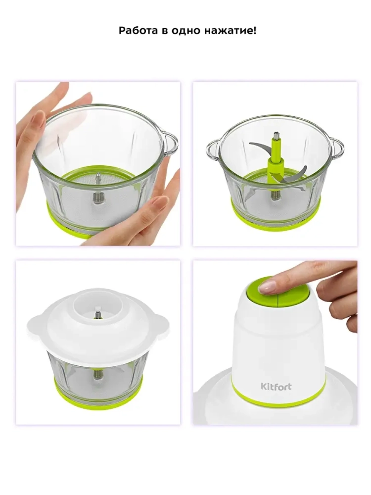 Измельчитель Kitfort КТ-3050 - устройство для быстрого измельчения мяса, твердого сыра, овощей, трав, чеснока, ягод и многих других продуктов. Двойной нож измельчает ингредиенты практически по всей высоте чаши. Процесс измельчения пищи происходит намного быстрее, чем при использовании ручных кухонных приспособлений. Простой кухонный нож для ручной нарезки и измельчения не выдерживает никакой конкуренции с этим компактным устройством. Любой салат будет готов за считанные минуты. Все что потребуется - подготовить продукты для резки и следить за степенью измельчения. Чаша измельчителя выполнена из прочного закаленного стекла, что дает возможность наблюдать за процессом и контролировать степень измельчения. Чашу можно закрыть крышкой и использовать для хранения продуктов в холодильнике. Для обеспечения безопасности КТ-3050 может работать только с правильно установленным моторным блоком на крышке чаши.