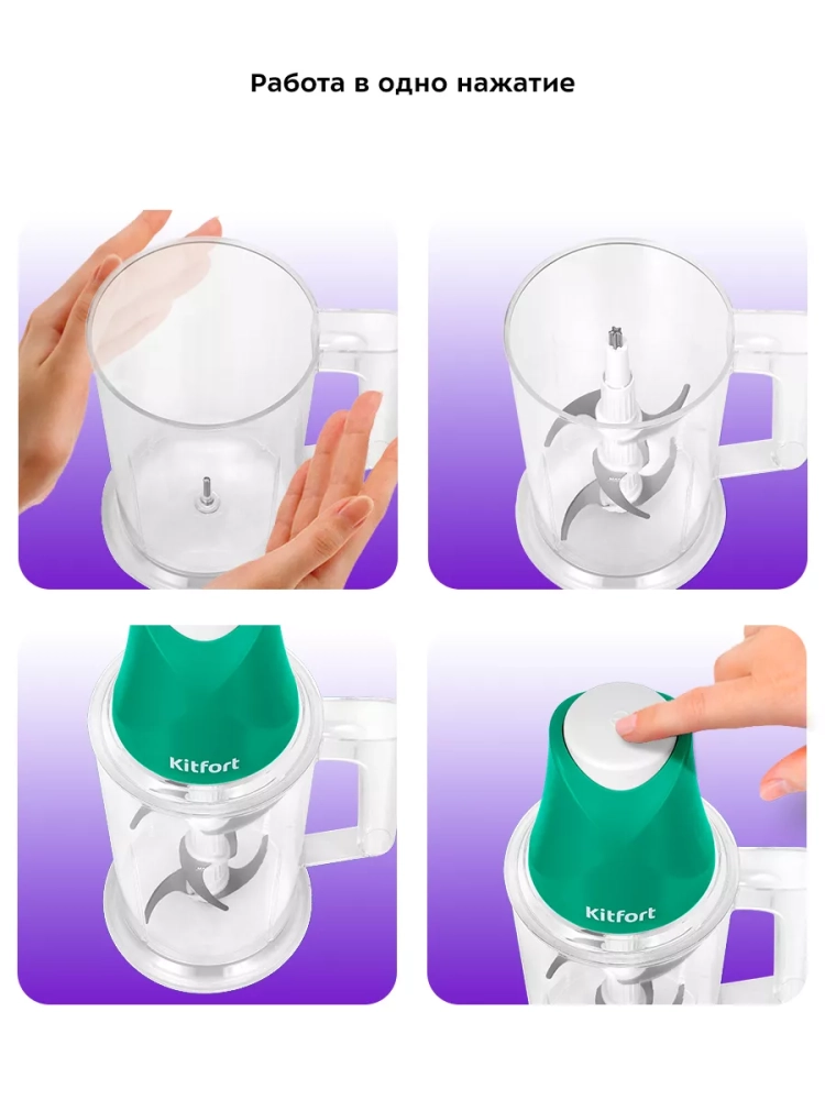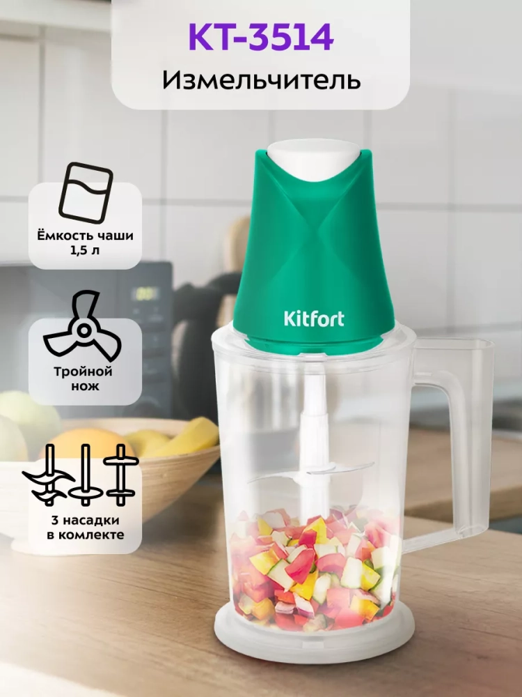 Измельчитель «3 в 1» Kitfort КТ-3514 — устройство для быстрого измельчения мяса, твердого сыра, овощей, трав, чеснока, ягод и многих других продуктов. Три блока двойных ножей измельчают ингредиенты практически по всей высоте чаши. Процесс измельчения пищи происходит намного быстрее, чем при использовании ручных кухонных приспособлений. Любой салат будет готов за считанные минуты. Все что потребуется — подготовить продукты для резки и следить за степенью измельчения.