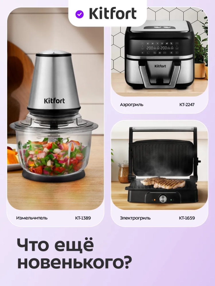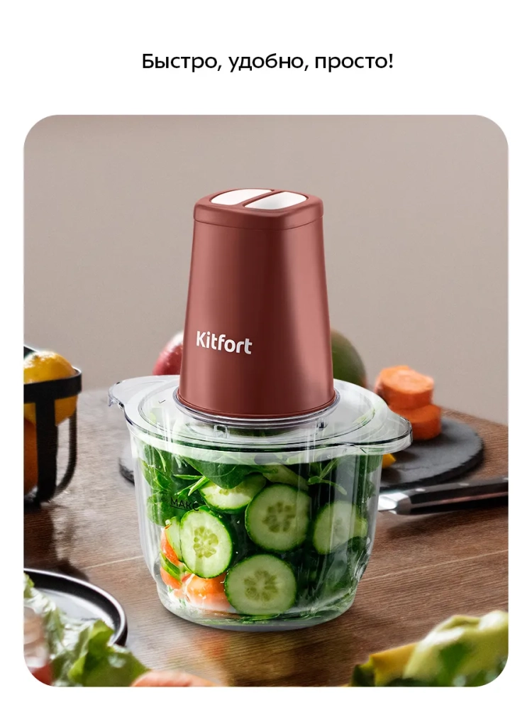 Измельчитель Kitfort КТ-3534 — устройство для быстрого измельчения мяса, твердого сыра, овощей, трав, чеснока, ягод и многих других продуктов. Два блока двойных ножей измельчают ингредиенты практически по всей высоте чаши. Процесс измельчения пищи происходит намного быстрее, чем при использовании ручных кухонных приспособлений. Любой салат будет готов за считанные минуты. Все что потребуется — подготовить продукты для резки и следить за степенью измельчения.