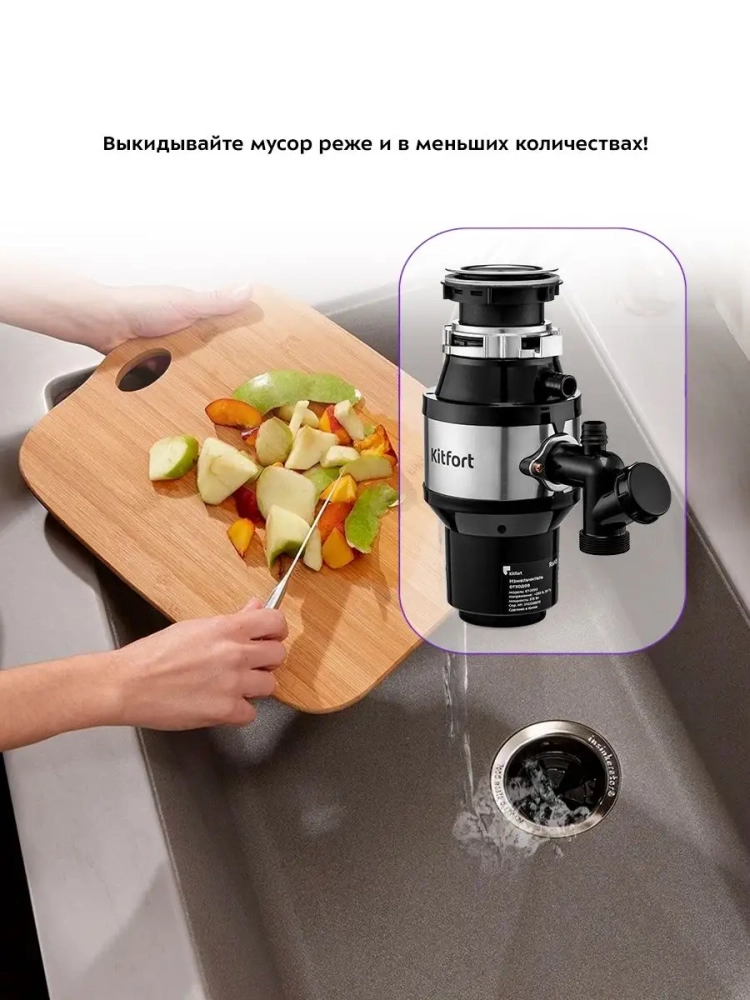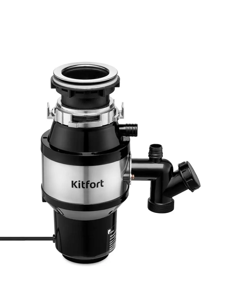 Измельчитель отходов Kitfort KT-2090 — устройство, предназначенное для установки под мойку и измельчения пищевых отходов. Пищевые отходы измельчаются на маленькие частицы и затем беспрепятственно утекают в канализацию с водой. Измельчитель отходов способен избавить от скопления большого количества отходов и потребности часто выносить мусор, неприятных запахов из мусорного ведра и засора канализации. Измельчитель пищевых отходов подходит практически для всех видов пищевых отходов. Исключение составляют длинные или крупные кости, раковины моллюсков, большие объемы яичной скорлупы сразу, длинные волокнистые продукты, например, целый початок кукурузы или стебель сельдерея. Небольшие кости и отходы от фруктов, наоборот, подходят для переработки в измельчителе отходов и при этом очищают камеру измельчителя. Нельзя измельчать стекло, пластик, металл или другие непищевые продукты. Измельчитель KT-2090 поставляется с проталкивателем, который может служить пробкой для мойки, и пневмокнопкой. Вы можете закрыть проталкивателем сливное отверстие мойки при необходимости набрать воду. Чтобы во время работы измельчителя из камеры не выбрасывало части измельчаемых отходов, в фланец мойки устанавливается защитный экран. Защитный экран также предотвращает попадание в камеру измельчителя посторонних предметов Пневмокнопка устанавливается в столешницу или мойку и не занимает много места на рабочей поверхности. Пневмокнопка позволяет включить и выключить измельчитель даже влажными руками. Установить измельчитель не сложно, однако надо учитывать, что устройство довольно большое и занимает много места в шкафчике под мойкой. Измельчитель KT-2090 подходит для моек с толщиной дна в районе сливного отверстия не более 1,2 см и диаметром отверстия в мойке не менее 8,5 см (стандартные широкие отверстия в мойке обычно составляют 9 см и отлично подходят для монтажа).