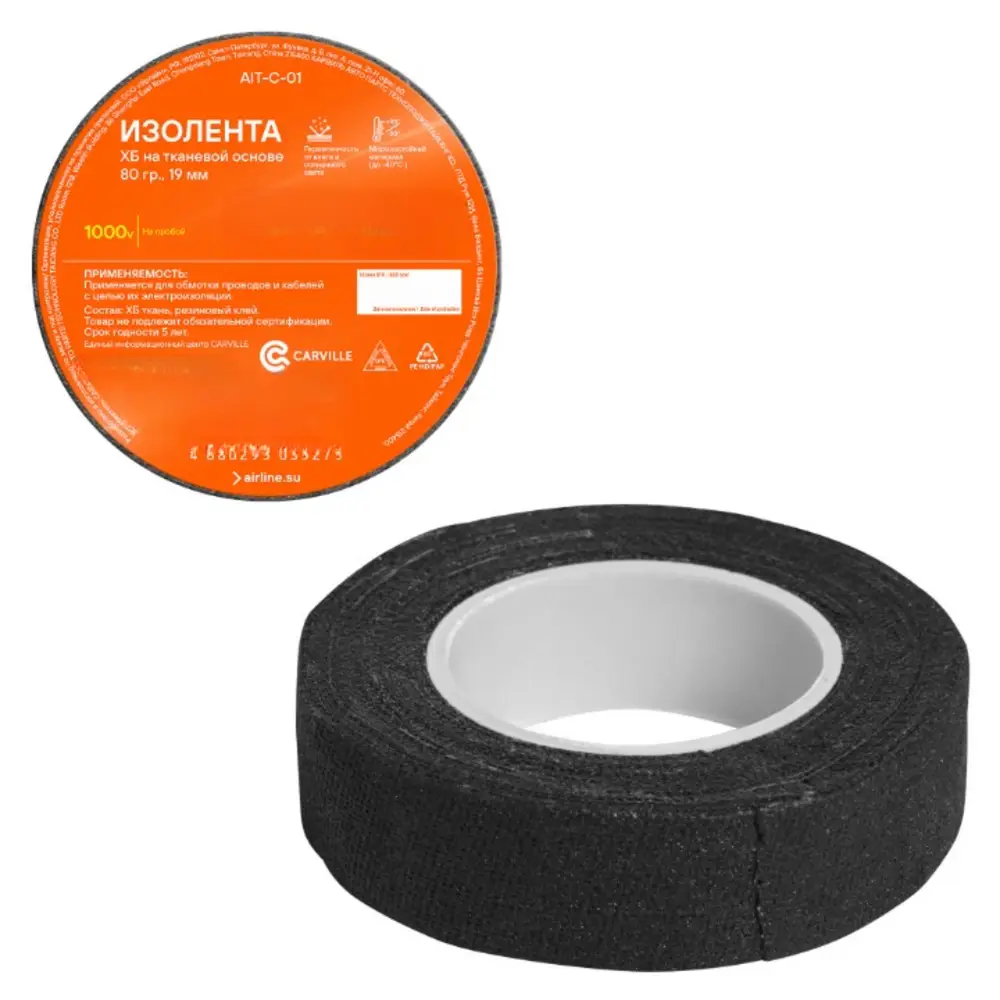Изолента ХБ на тканевой основе, которая является расходным материалом и предназначена для обмотки проводов и кабелей с целью их электроизоляции. Изолента AIRLINE представляет собой прорезиненную хлопчатобумажную текстильную ленту, имеющую клейкую поверхность. Её диэлектрические и изоляционные свойства ограничены значением до 1000 вольт. Касательно практического использования: у данного вида изоляционной ленты, существует такое достоинство, как использование ее в очень жарких и горячих местах. При сильном нагреве она не плавиться, а коксуется, тем самым защищая от прямого замыкания оголённые участки проводов с другими токопроводящими частями..