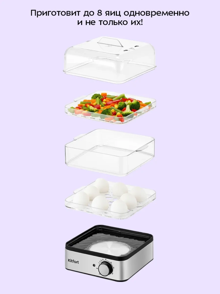 Яйцеварка «2 в 1» Kitfort КТ-6958 совмещает в себе яйцеварку и пароварку, потому что предназначена для варки яиц и других продуктов на пару. Вареные яйца — неотъемлемый элемент вкусного, полезного, а самое главное, простого завтрака. Иногда в утренней спешке не получается аккуратно положить яйца в кастрюлю с водой или вода слишком горячая, и яйца бьются друг о друга. С данным устройством таких проблем не возникнет.