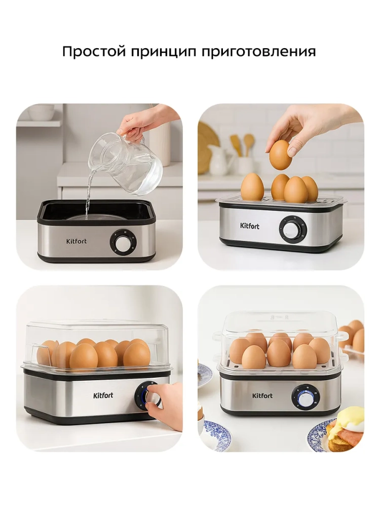 Яйцеварка Kitfort отличается эргономичной формой, которая позволяет разместить до шести яиц одновременно, обеспечивая равномерное распределение тепла. Автоматическая функция отключения после завершения варки предотвращает перегрев и обеспечивает безопасность использования. Электрическая яйцеварка Kitfort идеально подходит для тех, кто ценит удобство и надежность в процессе приготовления пищи.
