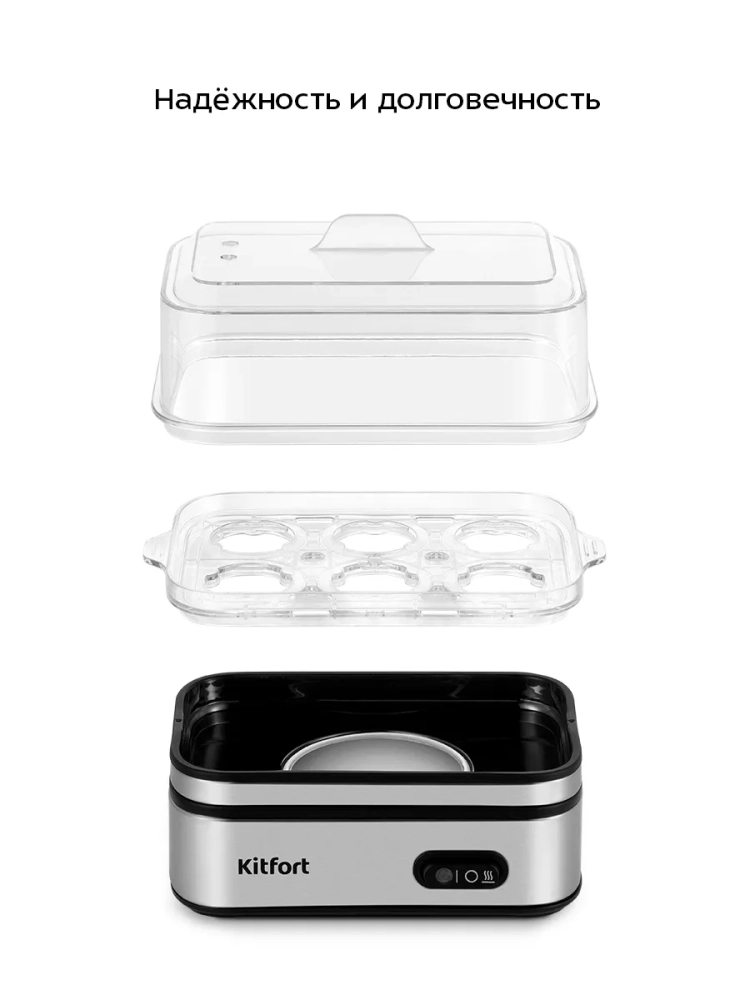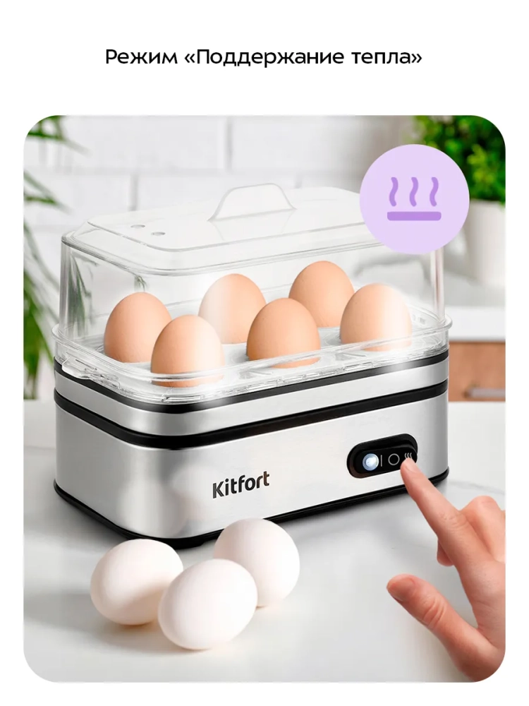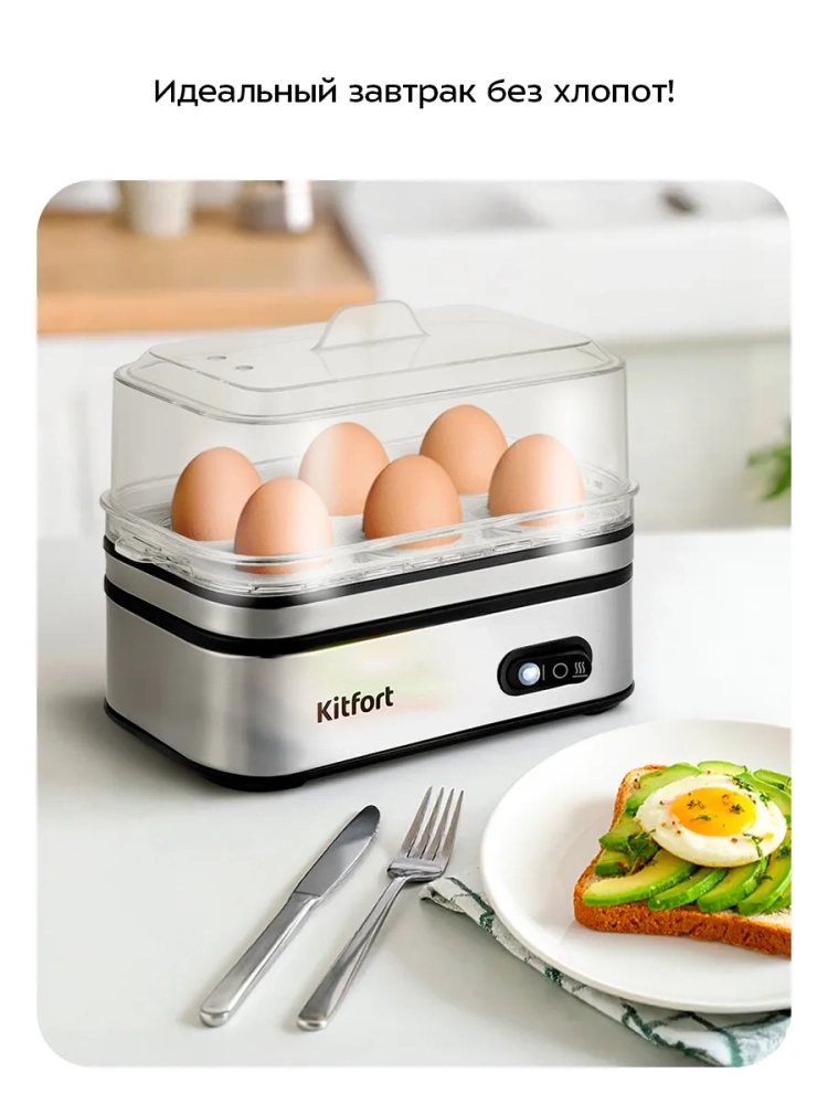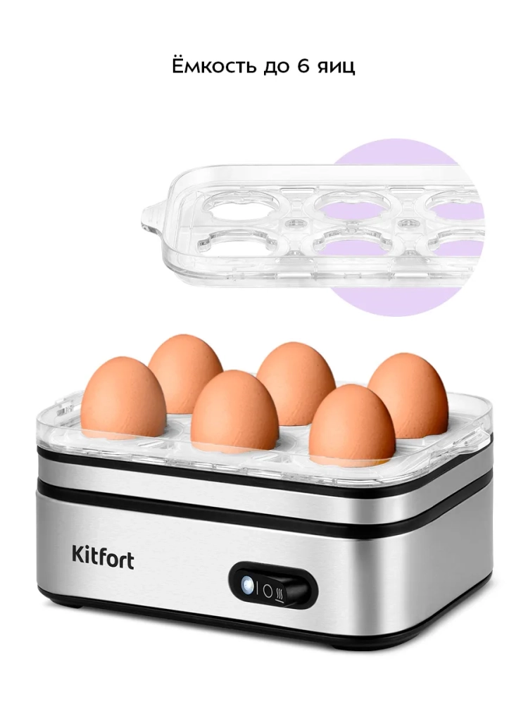 Яйцеварка Kitfort КТ-6957 предназначена для варки яиц на пару. Вареные яйца — неотъемлемый элемент вкусного, полезного, а самое главное простого завтрака. Иногда в утренней спешке не получается аккуратно положить яйца в кастрюлю с водой или вода слишком горячая, и яйца бьются друг о друга.