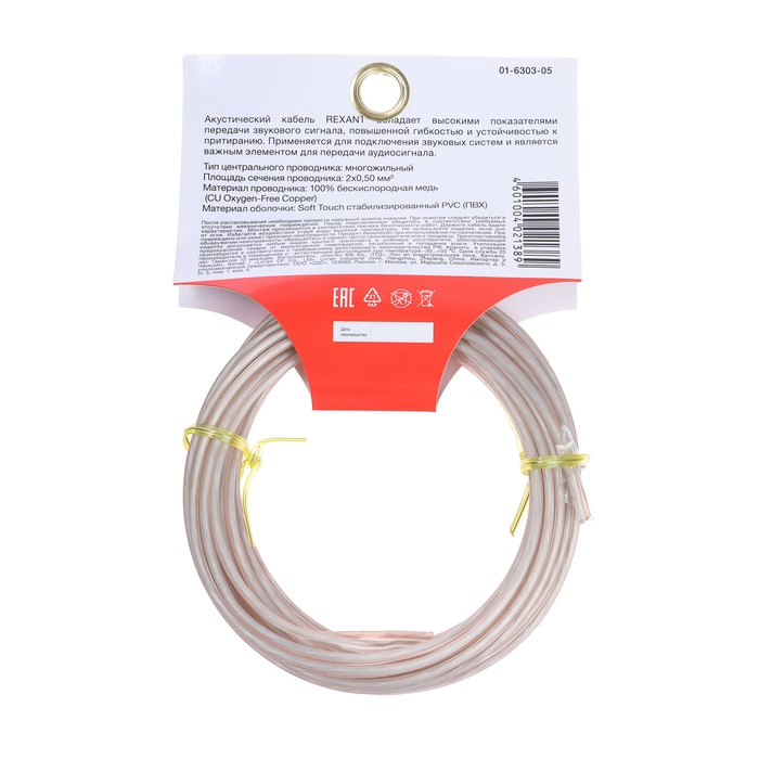 Кабель акустический REXANT SILICON, 2 х 0,5 мм², прозрачный, мини-бухта, 5 м