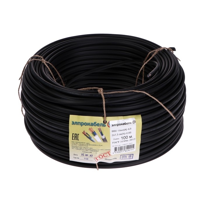 Кабель твердый плоский негорючий малодымный ПромЭл ВВГп-нг(А) LS, 2х1.5, 100 м, ГОСТ