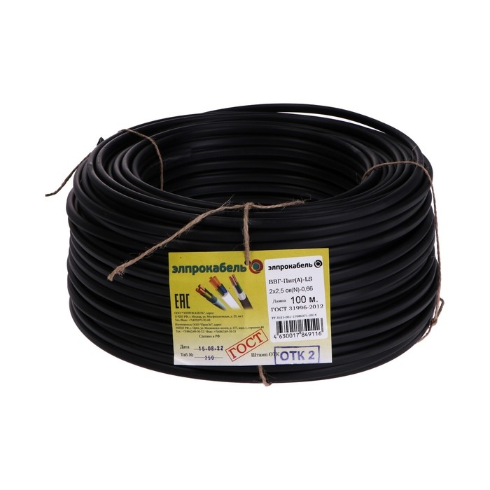 Кабель твердый плоский негорючий малодымный ПромЭл ВВГп-нг(А) LS, 2х2.5, 100 м, ГОСТ